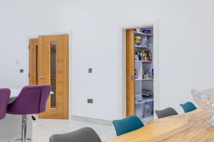 Integrated double oven, hob and dishwasher / Plumbed for "American" fridge freezer / Feature free-standing cast iron stove with slate hearth / Access to fully shelved Walk-in Pantry via sliding "pocke