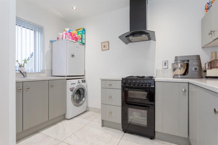 (max) Full range of light grey high and low level units with feature button handles and complimentary work surfaces. Space for gas cooker with over head extractor. Single drainer stainless steel sink unit and mixer taps. Plumbed for washing machine. Low voltage down lights. Fully tiled floor and matching skirting and splash back.