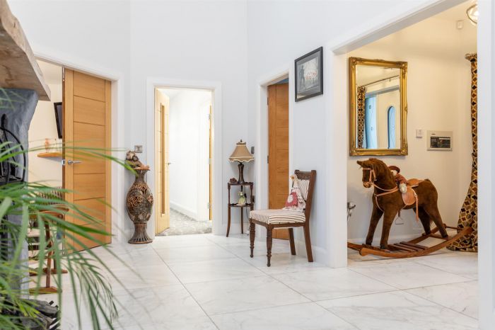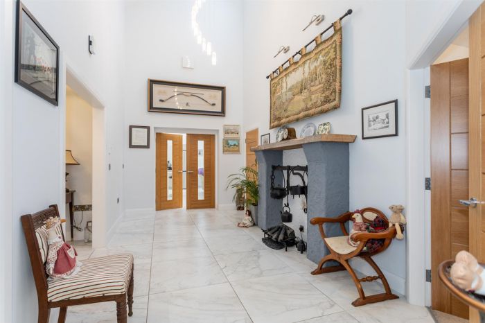 Spacious entrance foyer with fully tiled floor through open square archway to Entrance Hall with double height vaulted ceiling and feature mock fireplace / Walk-in cloaks room / Ground floor W/C