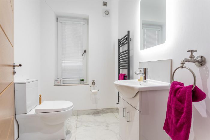 Modern white suite comprising push button low flush W/C and moulded wash hand basin in vanity with "monobloc" mixer taps and storage below. Fully tiled floor. Low voltage down lights. Grey coloured heated towel rail.