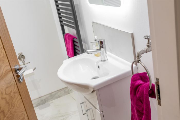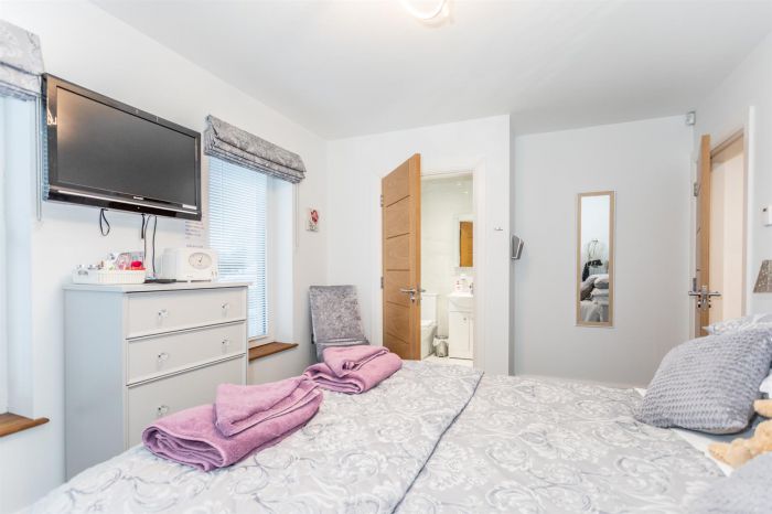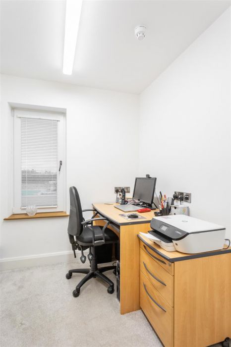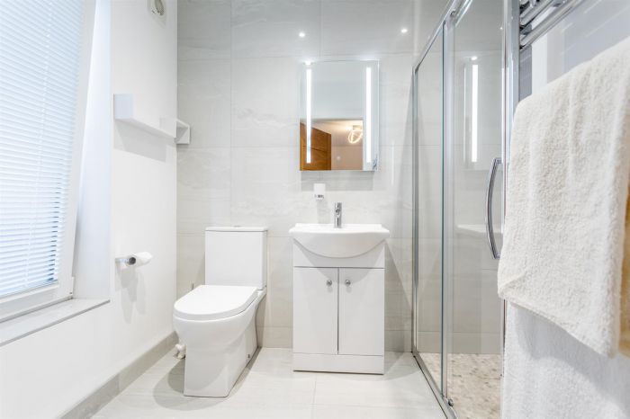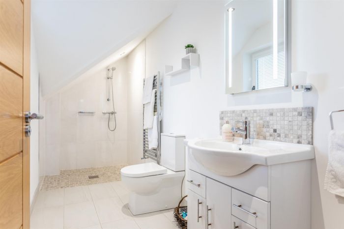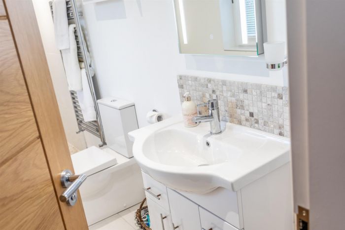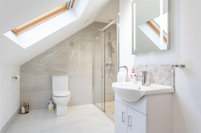 Modern white suite comprising push button low flush W/C and moulded wash hand basin in vanity with "monobloc" mixer tap, tiled splash back and storage below. Easy access fully tiled shower cubicle with thermostatic shower unit and sliding cubicle door. Low voltage down lights. Extractor fan. Fully tiled floor. "Keylite" double glazed roof light. Polished chrome heated towel rail.