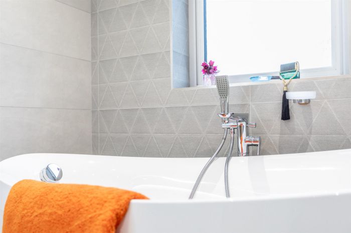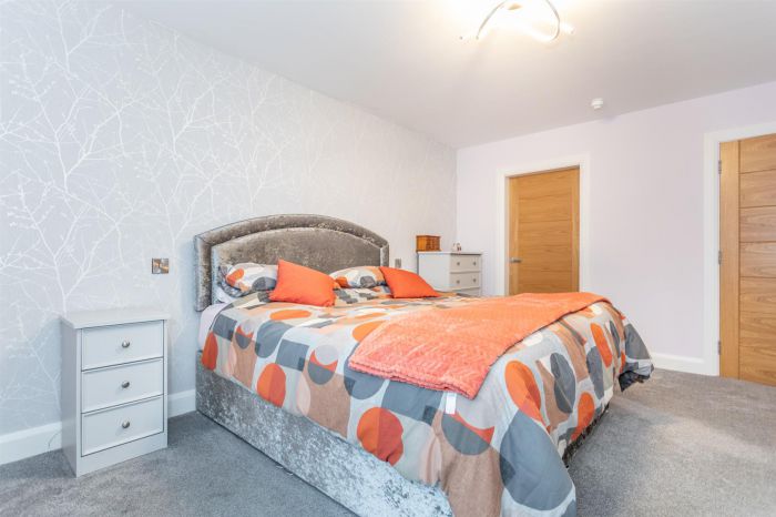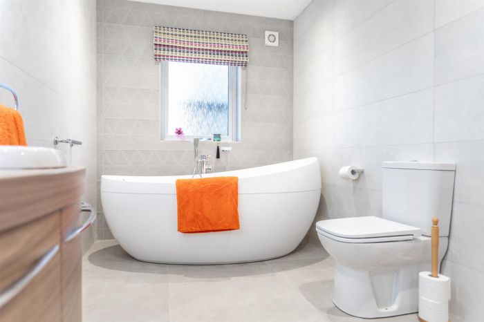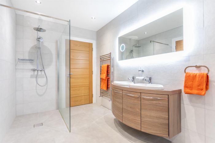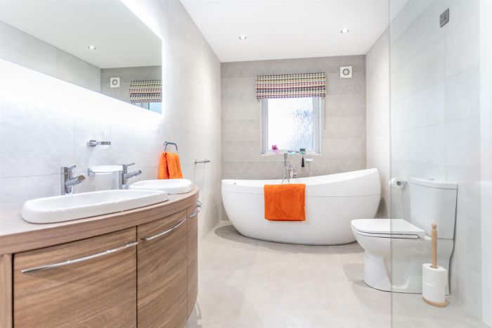 Modern white suite comprising "egg style" free standing bath with polished chrome tap stand and shower attachment. Push button low flush WC and feature wash hand basin in curved wall mounted vanity unit. Twin "monobloc" mixer taps. Easy access wet room style shower area with glazed screen and thermostatic shower unit comprising "drench" head and hand held shower. Fully tiled floor and walls. Low voltage down lights. Large format back light sensor mirror. Polished chrome heated towel rail. Secondary door to entrance hall.