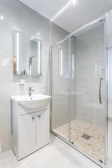Modern white suite comprising push button low flush W/C and modern wash hand basin in vanity with "monobloc" mixer taps and storage below. Sliding glazed entrance door to easy access wet room style fully tiled shower cubicle with thermostatic shower unit. Fully tiled floor and part tiled walls. Low voltage down lights. Polished chrome heated towel rail.