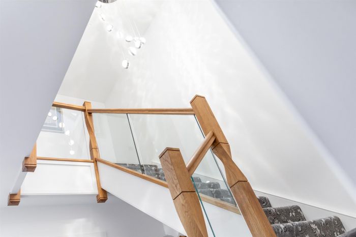 Wall light points. Stair case to first floor with feature newel post and glass balustrade.