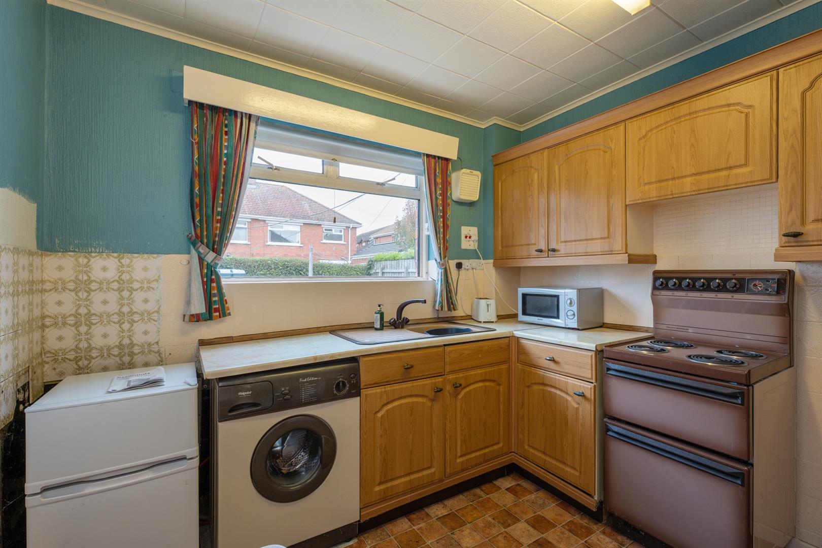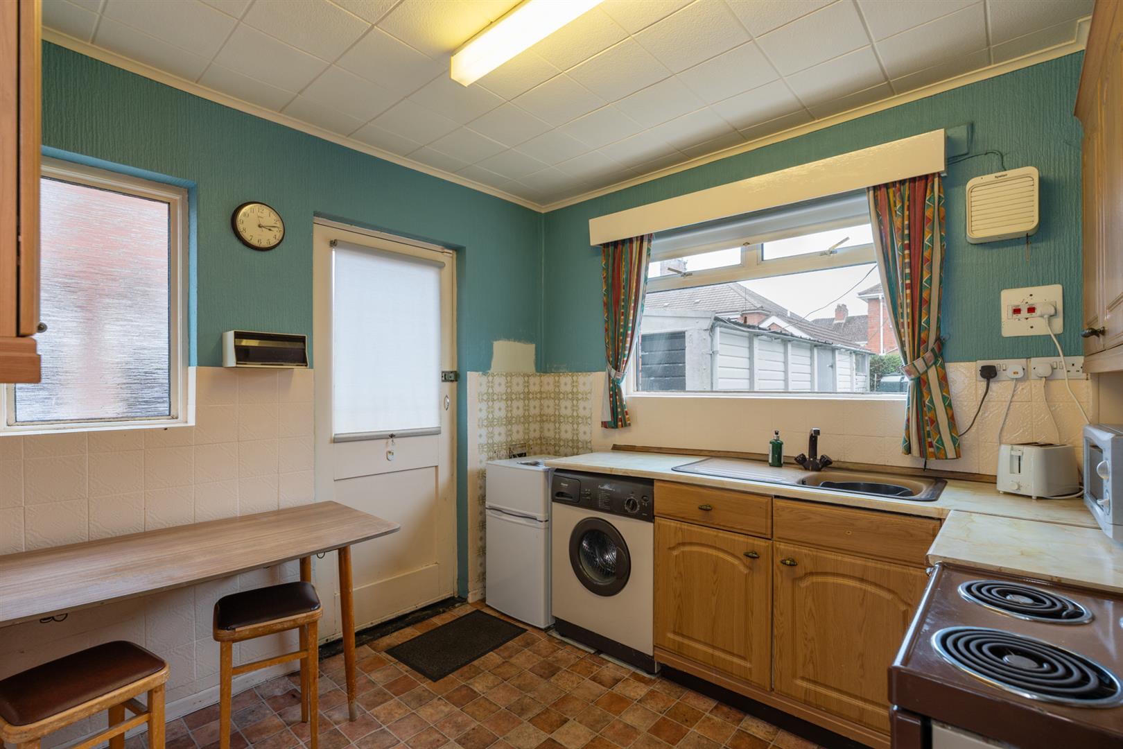 Range of high and low level units, inset sink unit with mixer taps, plumbed for washing machine, space for cooker, part tiled walls.