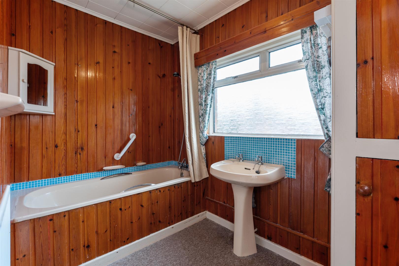 Coloured suite comprising: Wood panelled walls, panelled bath with mixer taps and telephone hand shower, pedestal wash hand basin, built in storage.