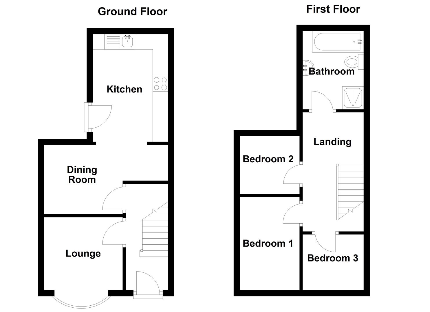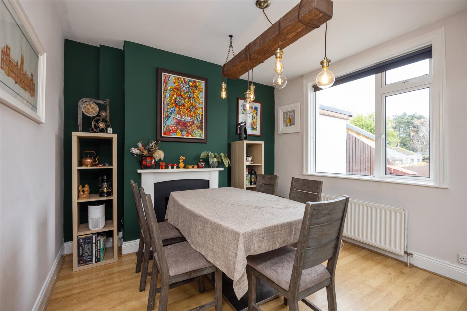 On entering, the entrance hall features attractive laminate strip wood flooring and leads to a comfortable living room with a bay window and decorative fireplace, creating a bright and welcoming space. The separate dining room, also with laminate flooring and a feature fireplace, opens to the kitchen with with a range of high and low level units, includes plumbing for a dishwasher, space for a range cooker, part tiled walls and fully tiled flooring, offering a practical and functional layout.