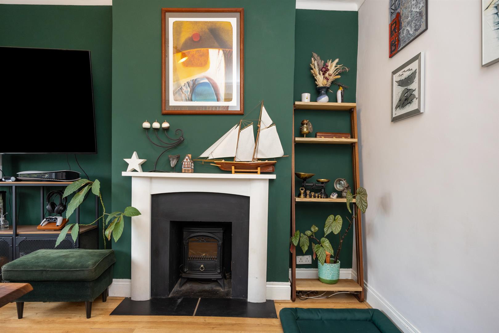 (into bay) Laminated strip wood flooring. Fireplace (not in use)