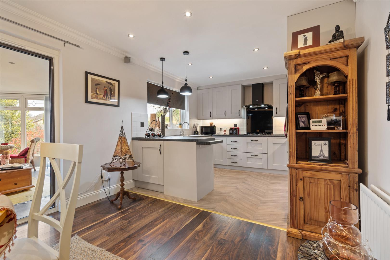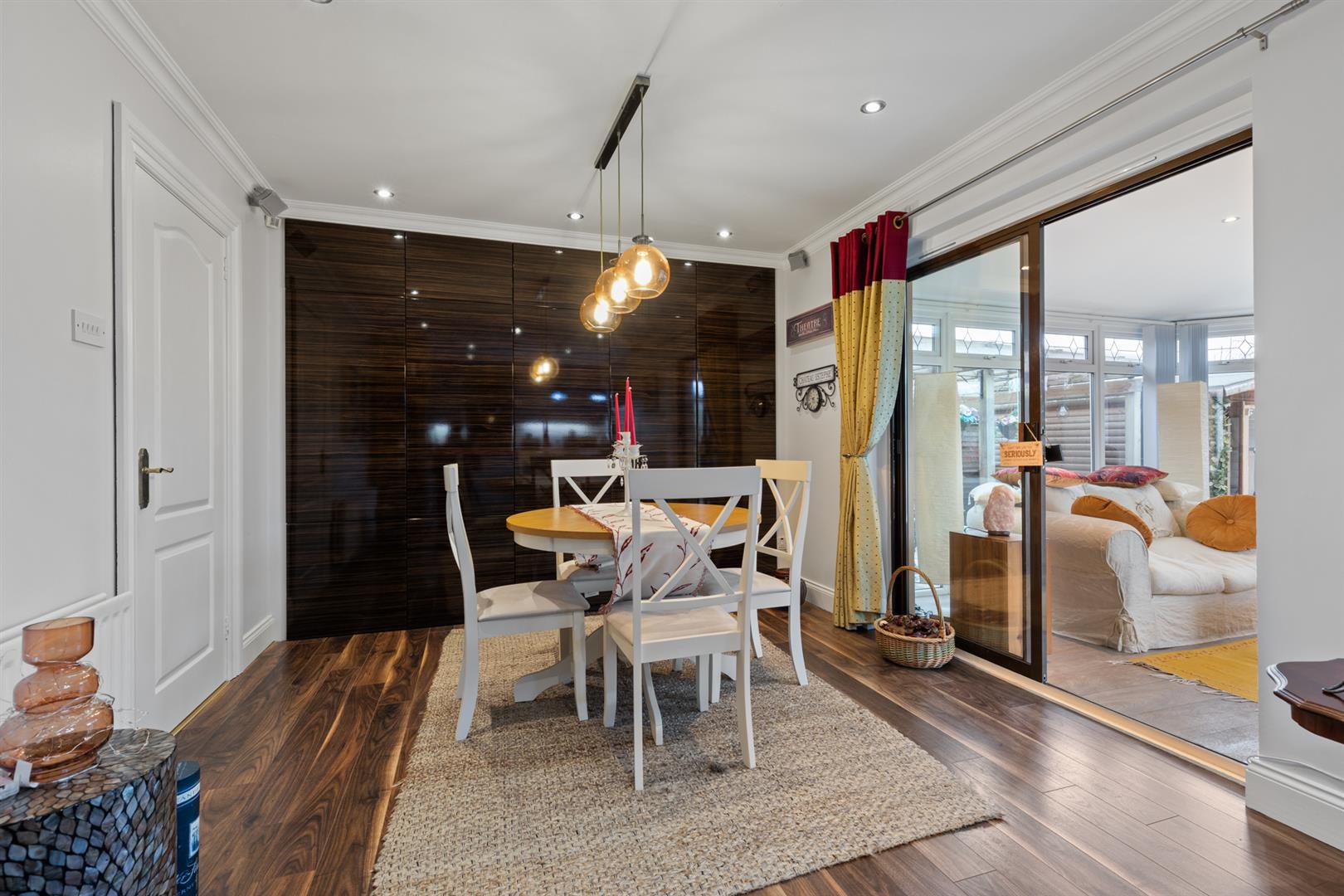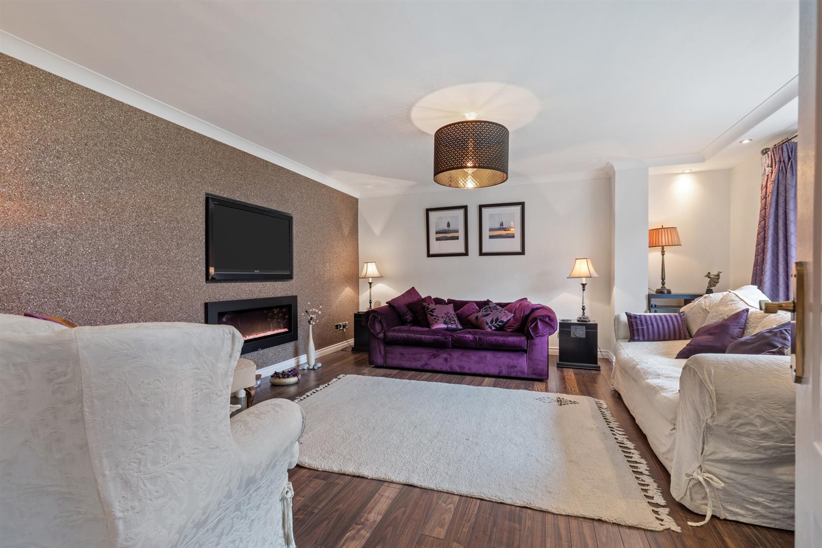 The property benefits from PVC double glazing and gas fired central heating. The ground floor comprises a welcoming entrance hall with storage under stairs, a generous lounge with feature media wall and built-in electric fire, and a separate dining room with a full range of built-in storage. The dining area is open plan to the kitchen, which offers a good range of high and low level units, integrated appliances and access via sliding doors to a sunroom, providing additional living space overlooking the rear garden.
