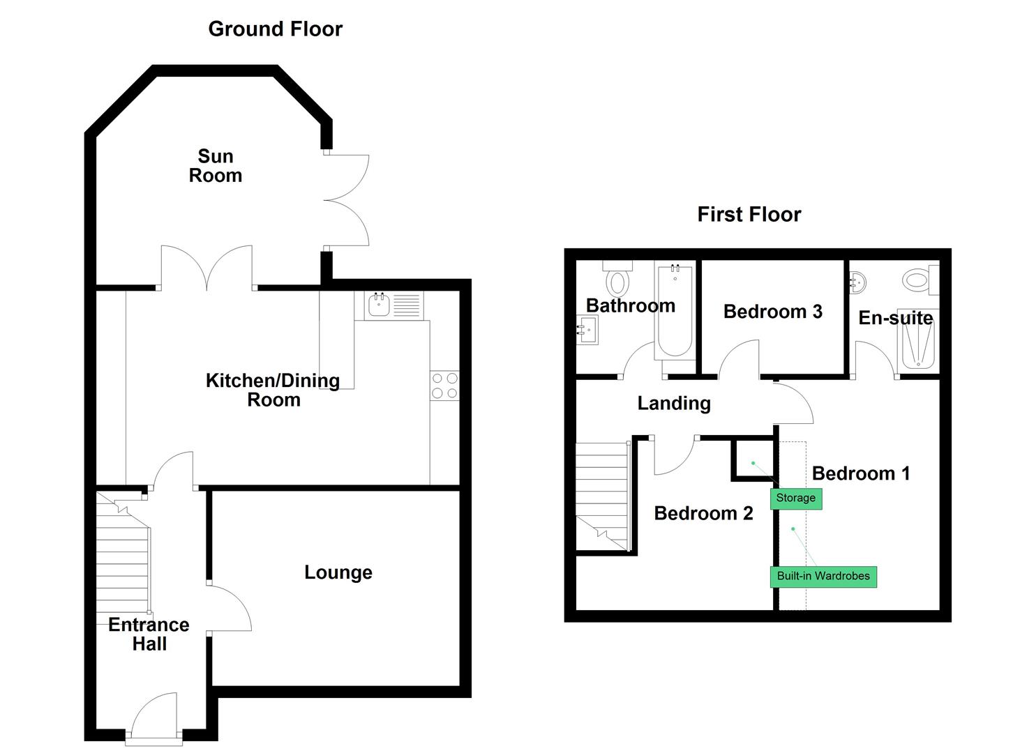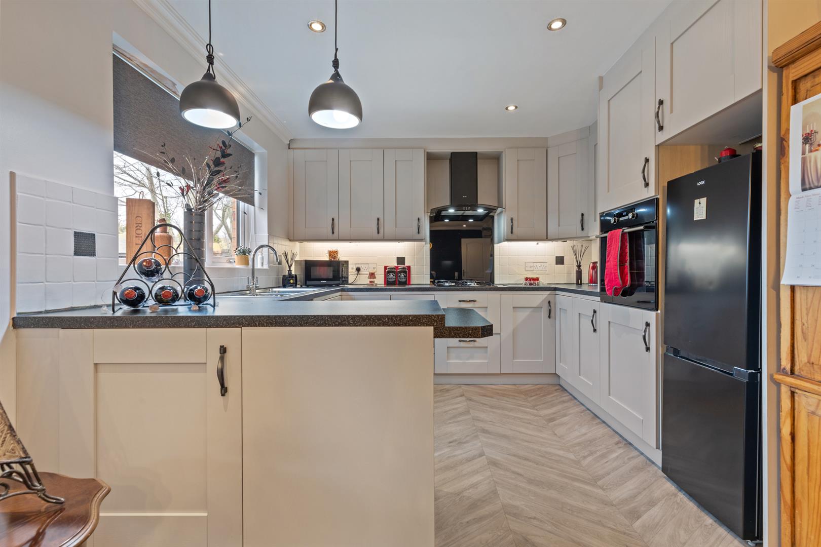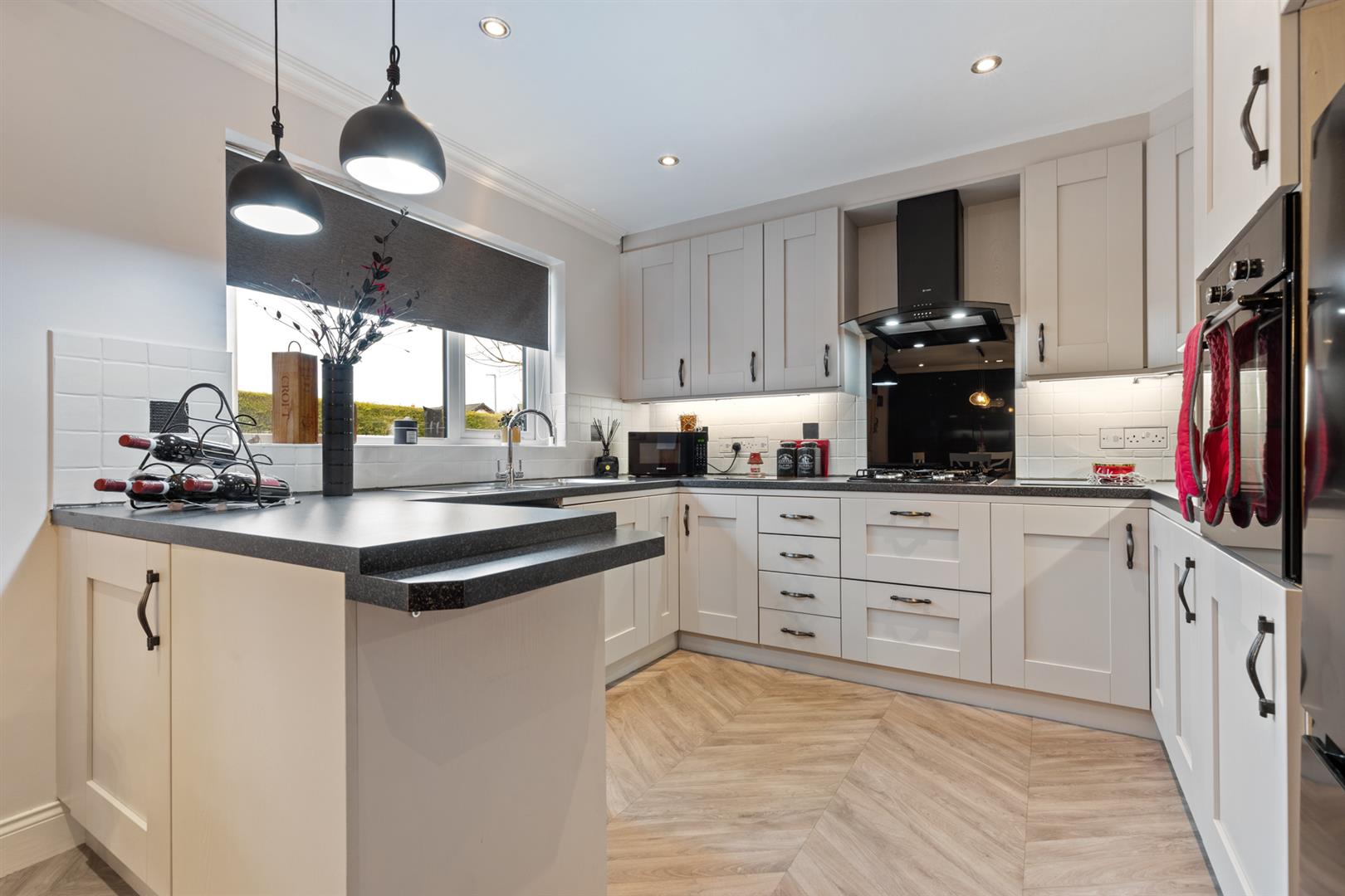 The property benefits from PVC double glazing and gas fired central heating. The ground floor comprises a welcoming entrance hall with storage under stairs, a generous lounge with feature media wall and built-in electric fire, and a separate dining room with a full range of built-in storage. The dining area is open plan to the kitchen, which offers a good range of high and low level units, integrated appliances and access via sliding doors to a sunroom, providing additional living space overlooking the rear garden.