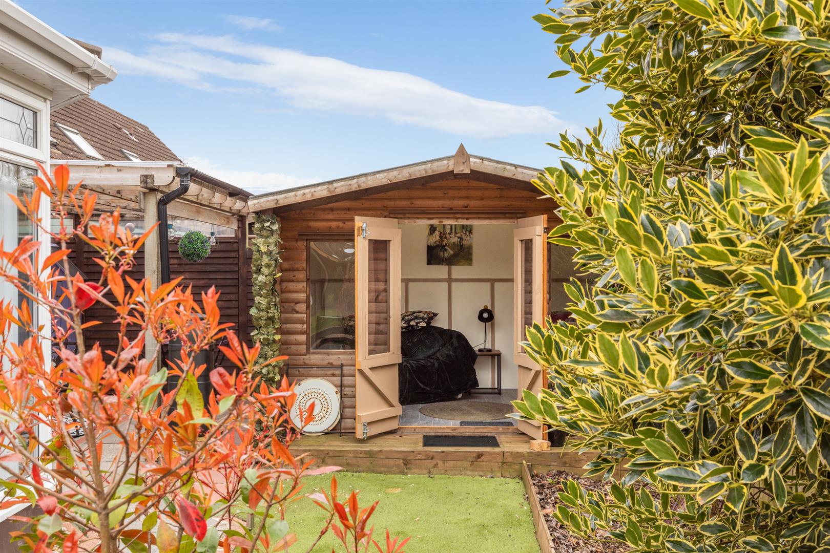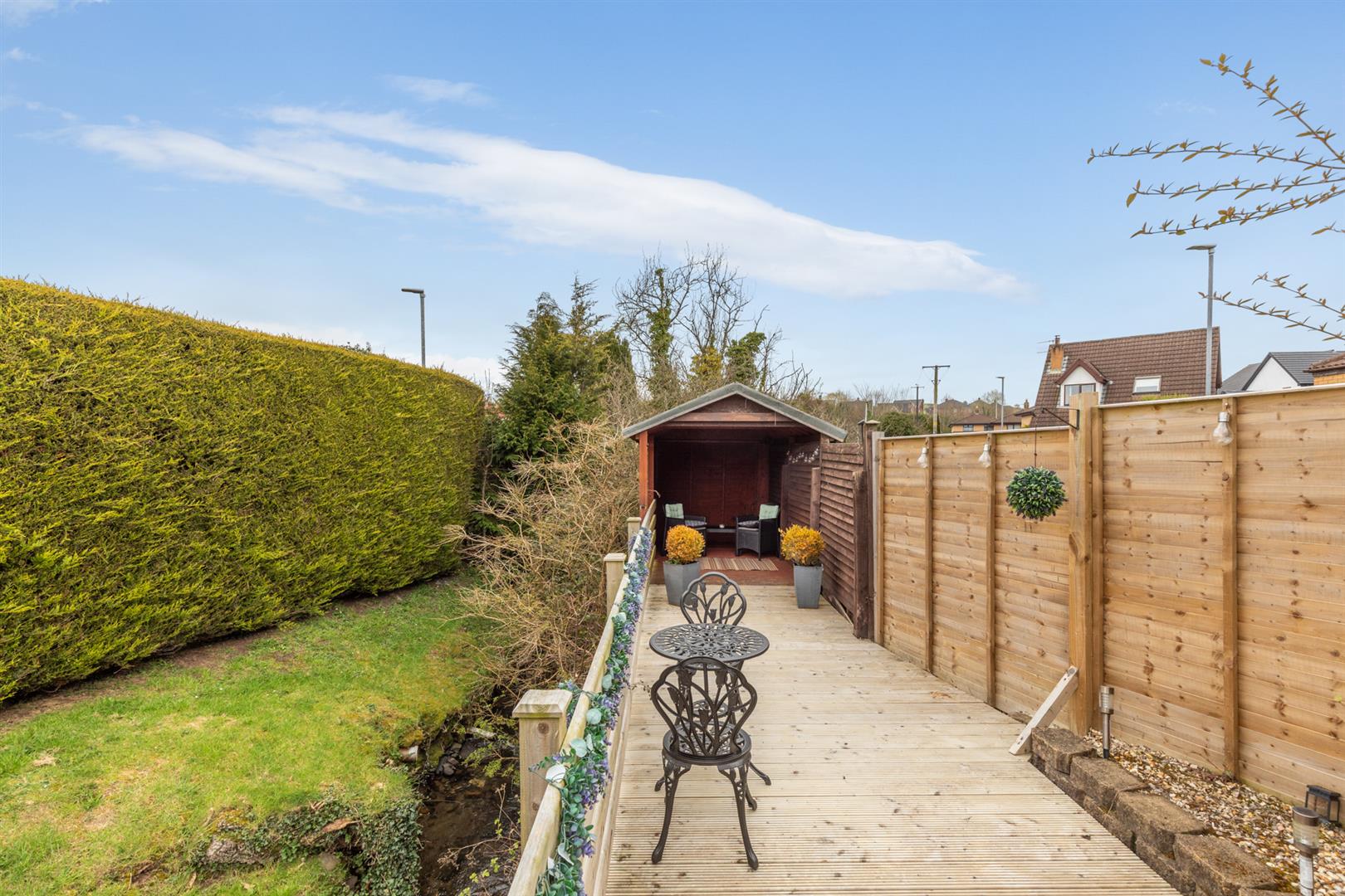 Externally, the property benefits from a front garden with lawn and driveway, while the enclosed rear garden is landscaped with lawn, artificial grass and raised flower beds. A timber decking area runs alongside a stream and includes covered seating areas, creating a private outdoor space. There is also a garden shed and a separate log cabin, both with electricity, offering useful additional space.