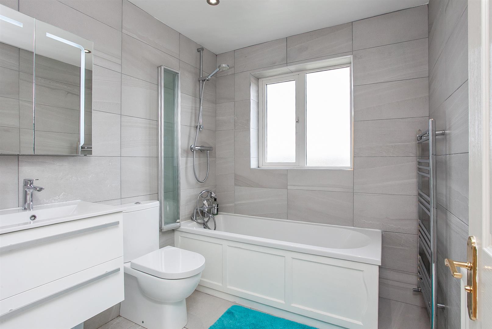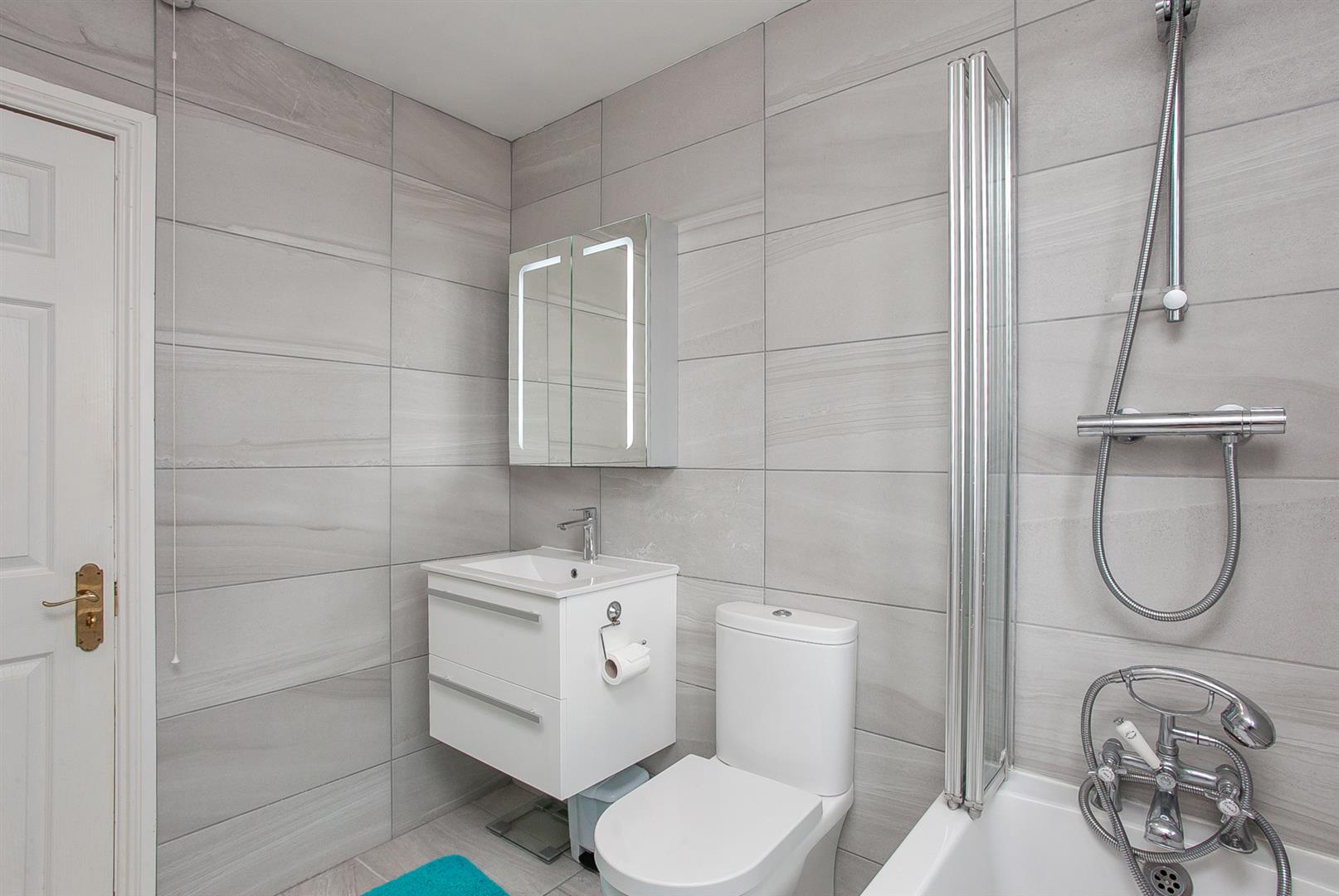 White suite comprising panelled bath, hand held shower, vanity unit, low flush WC and towel rail. Fully tiled walls, fully tiled flooring and recessed spotlighting.
