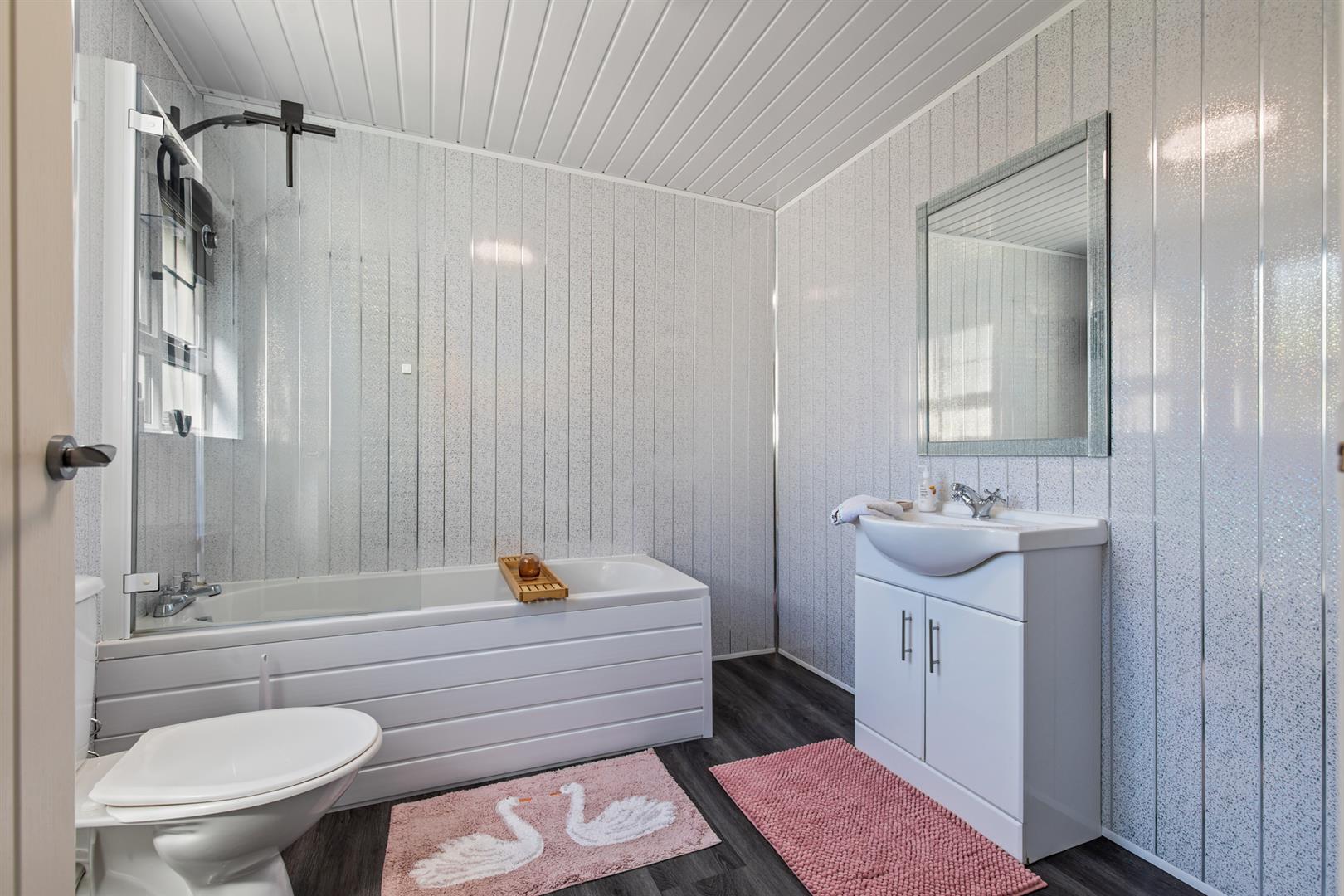 White suite comprising: panelled shower bath with electric shower, mixer tap and shower screen. Pedestal wash hand basin, low flush W/C, panelled walls, towel rail.