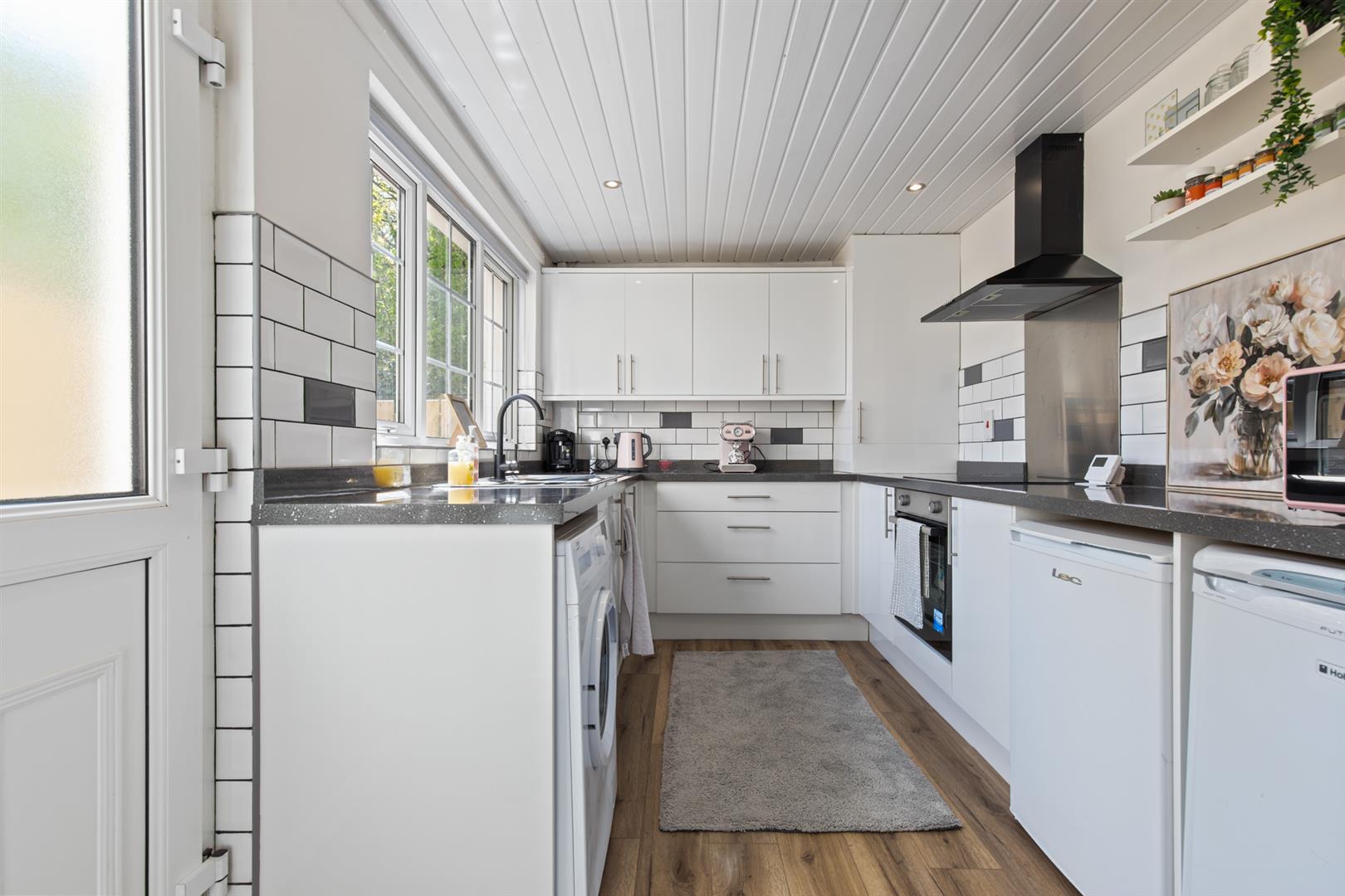 Single drainer stainless steel sink unit with mixer tap, extensive range of high and low level units, plumbed for washing machine, part tiled walls, stainless steel oven and ceramic hob, laminate strip wood flooring, PVC back door, gas boiler.