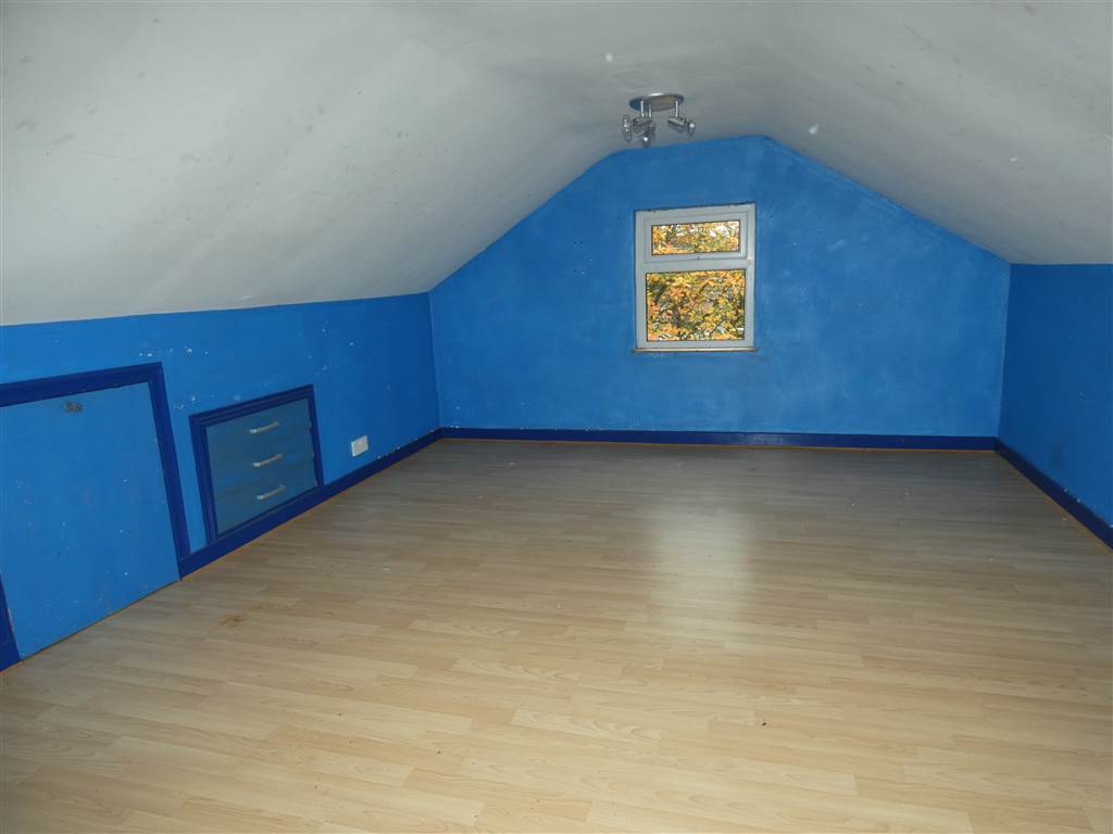 Hot press, lagged copper cylinder, immersion heater, permanent staircase to fully floored roof space.