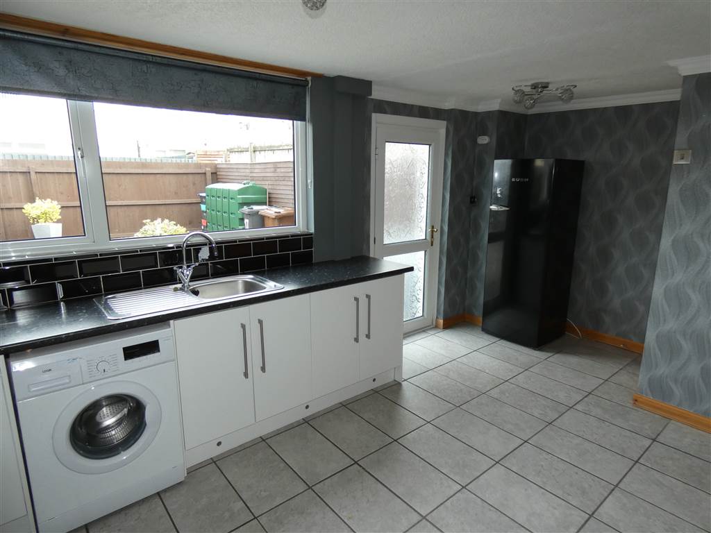 Extensive range of white high gloss high & low levels units, 1.5 bowl stainless steel sink unit with mixer tap, integrated stainless steel oven, 4 ring electric hob with stainless steel extractor hood over, plumbed for washing machine, plumbed for dishwasher, partially tiled walls, ceramic tiled floor, understair storage cupboard, Upvc double glazed door to rear.