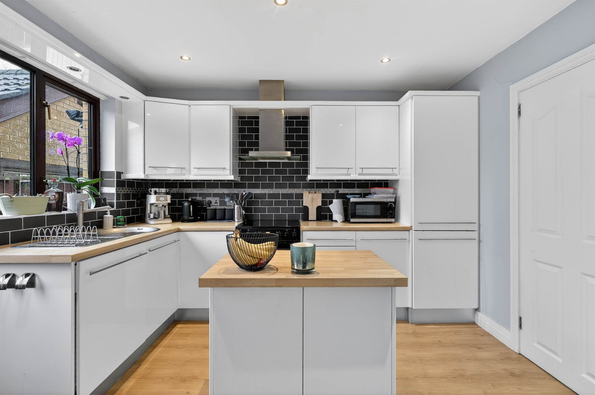 Range of high and low level units, work surfaces. Stainless steel sink unit with mixer tap. Space for oven and hob. Integrated fridge freezer and dishwasher. Under unit lighting. Island unit. Tiled splashback. Spotlights. Wood effect flooring. uPVC door to rear. Open plan to . . .