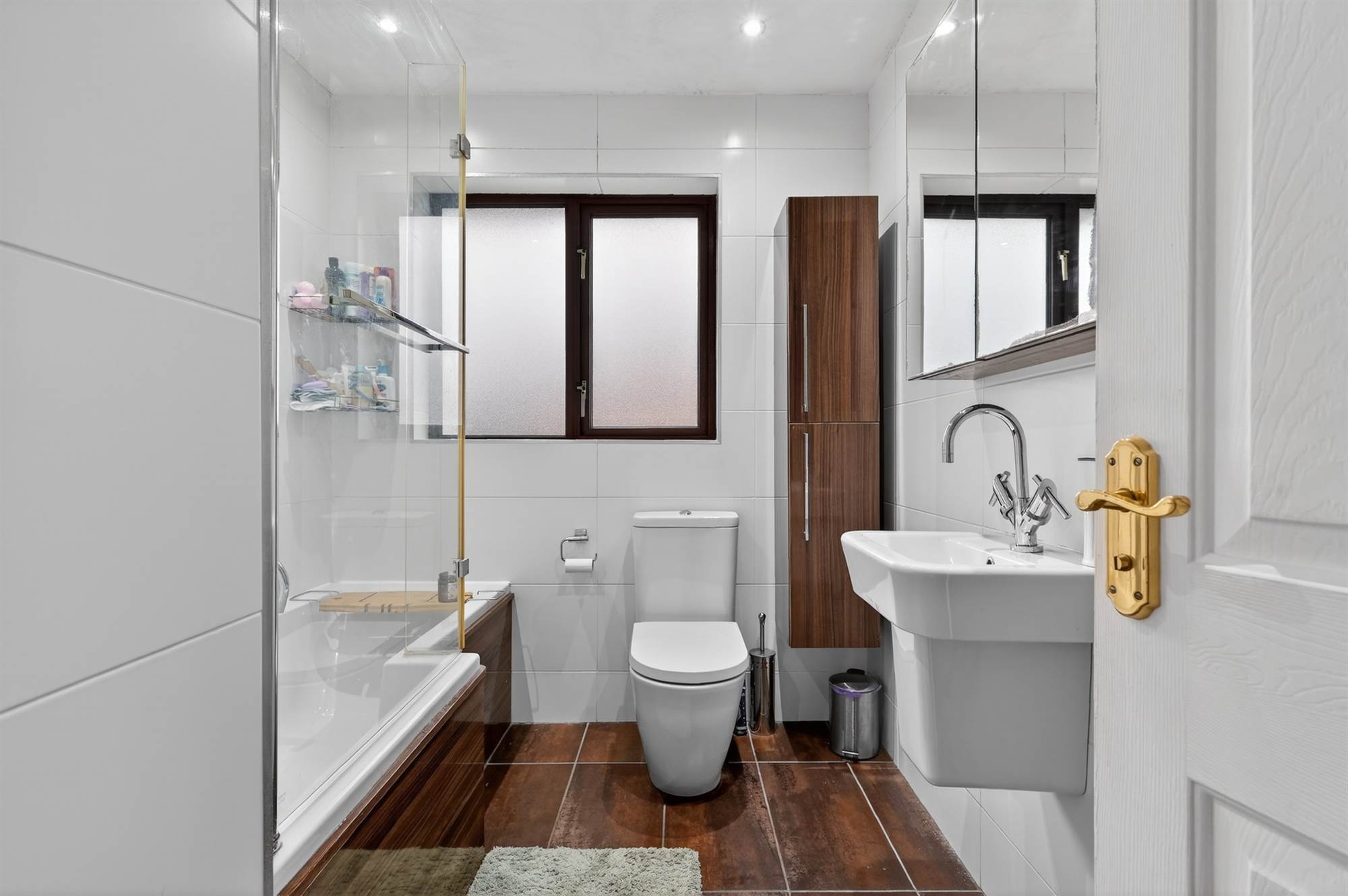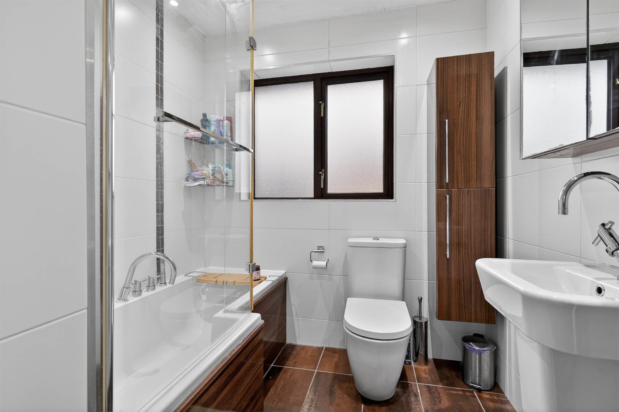 White suite comprising low flush wc. Floating wash hand basin with mixer tap. Wall-mounted cabinet. Panelled bath with thermostatic shower and glass screen. Fully-tilled walls, tiled floor. Spotlights.