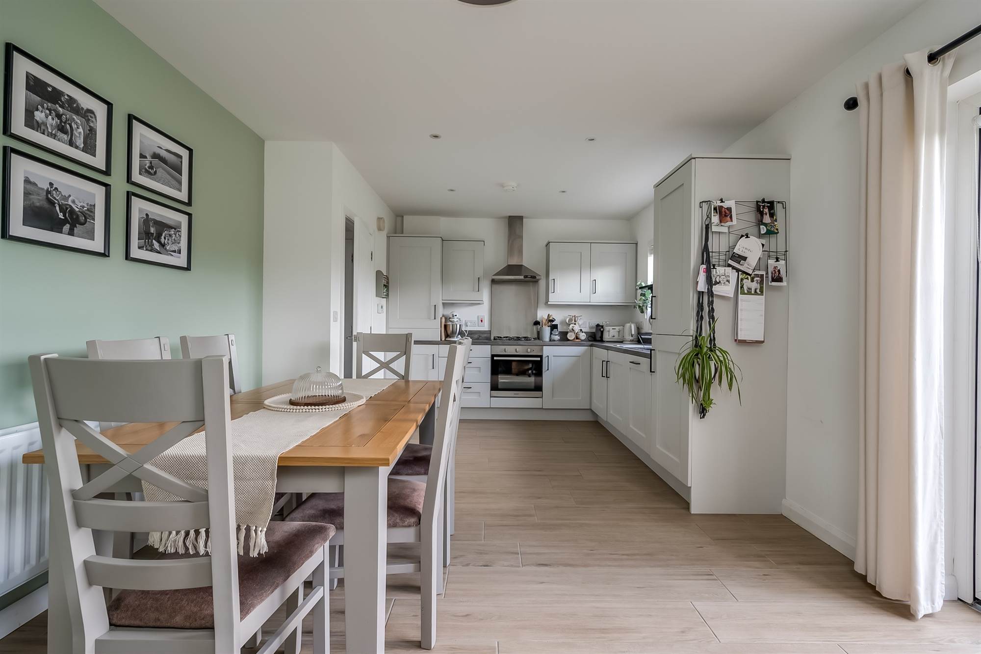Range of high and low level units, work surfaces. Stainless steel single drainer sink unit with chrome mixer tap. Underbench over, 4 ring gas hob above. Extractor. Intergrated dishwasher, integrated washing/dryer, integrated fridge/freezer. Tiled flooring. OPEN TO: