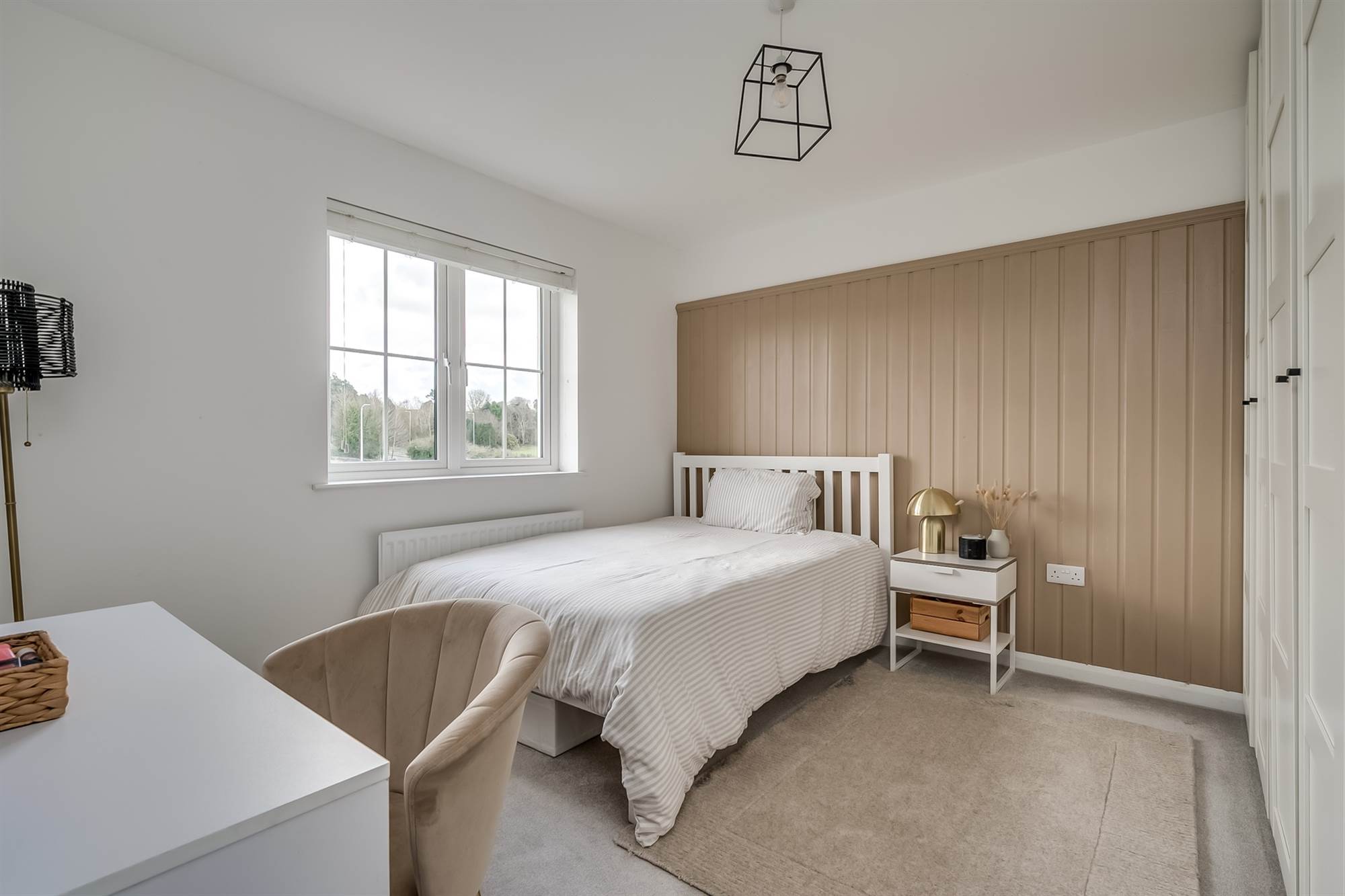 Feature wall with wood panelling. Outlook to rear.