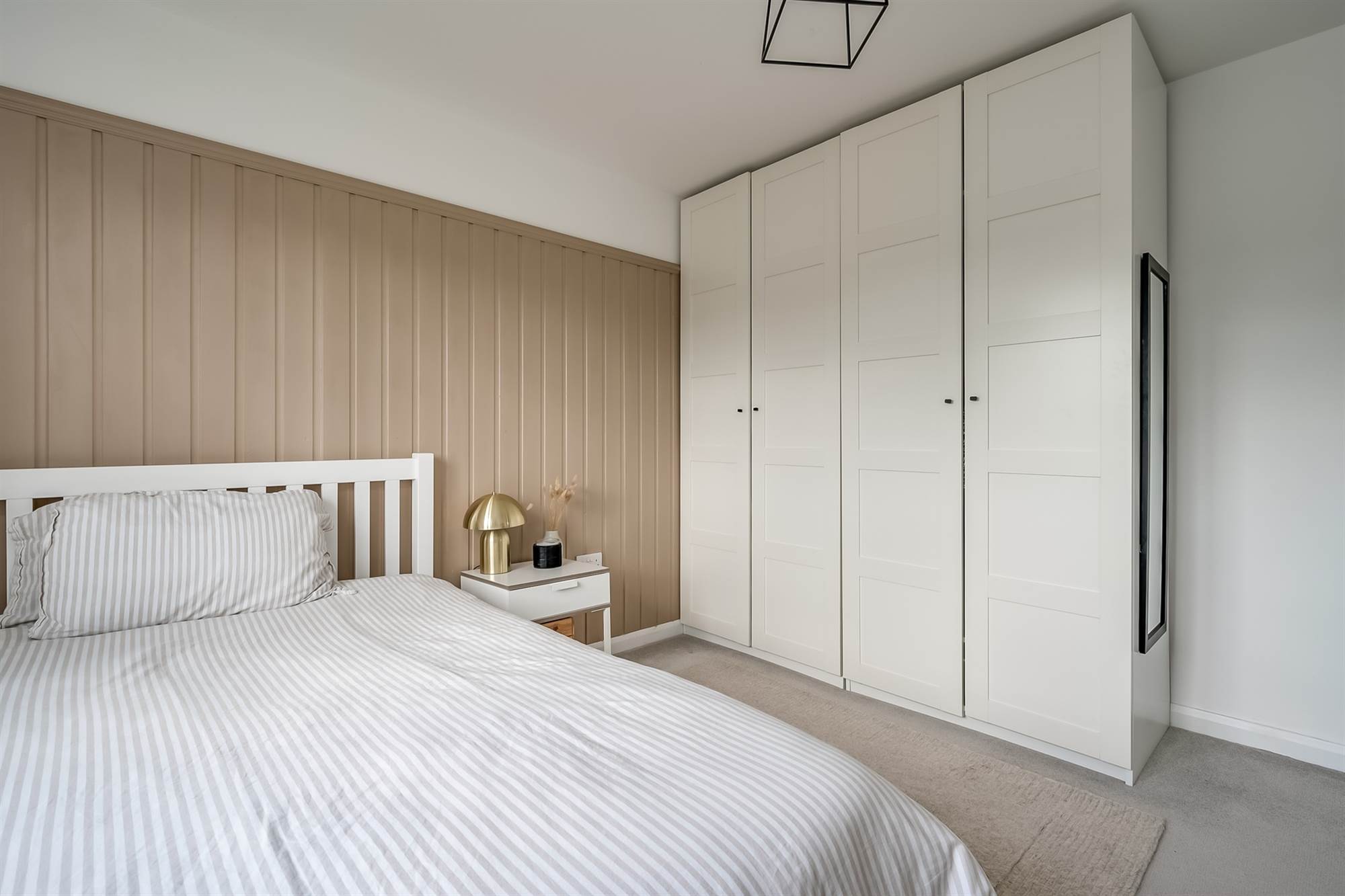 Feature wall with wood panelling. Built in wardrobe space. Door to: