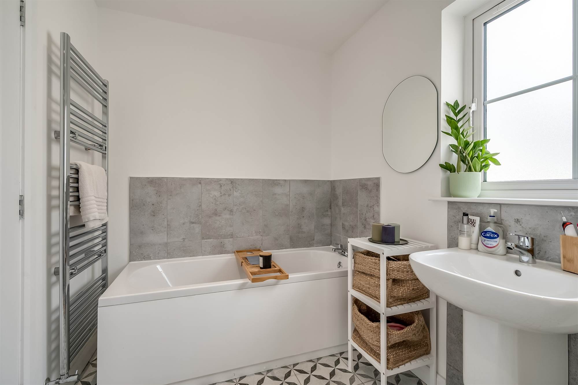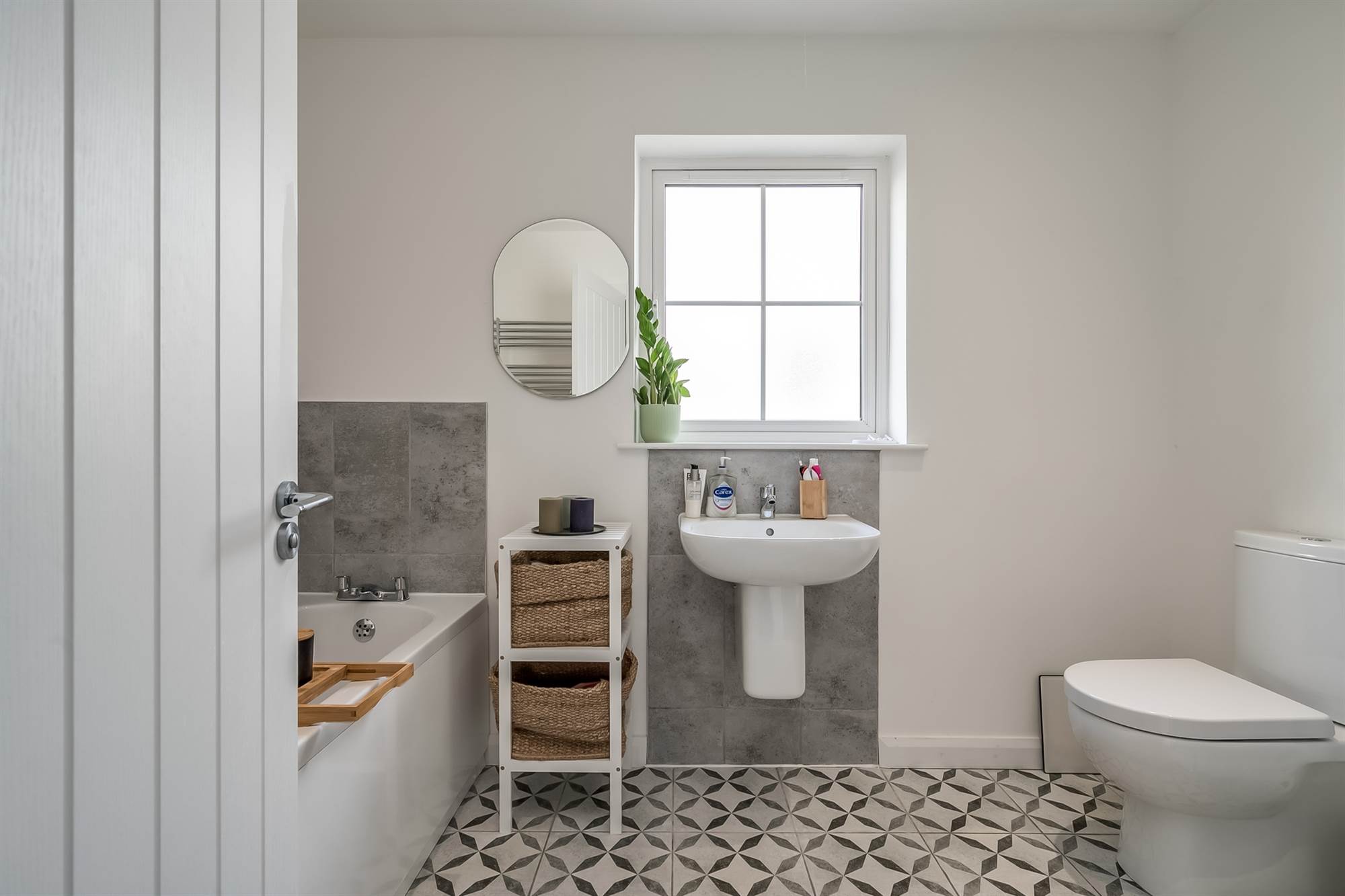 White suite comprising: Dual flush W.C. Wash hand basin with chrome mixer tap. Panelled bath with chrome mixer taps. Shower enclosure with thermostatic shower. Tiled flooring.
