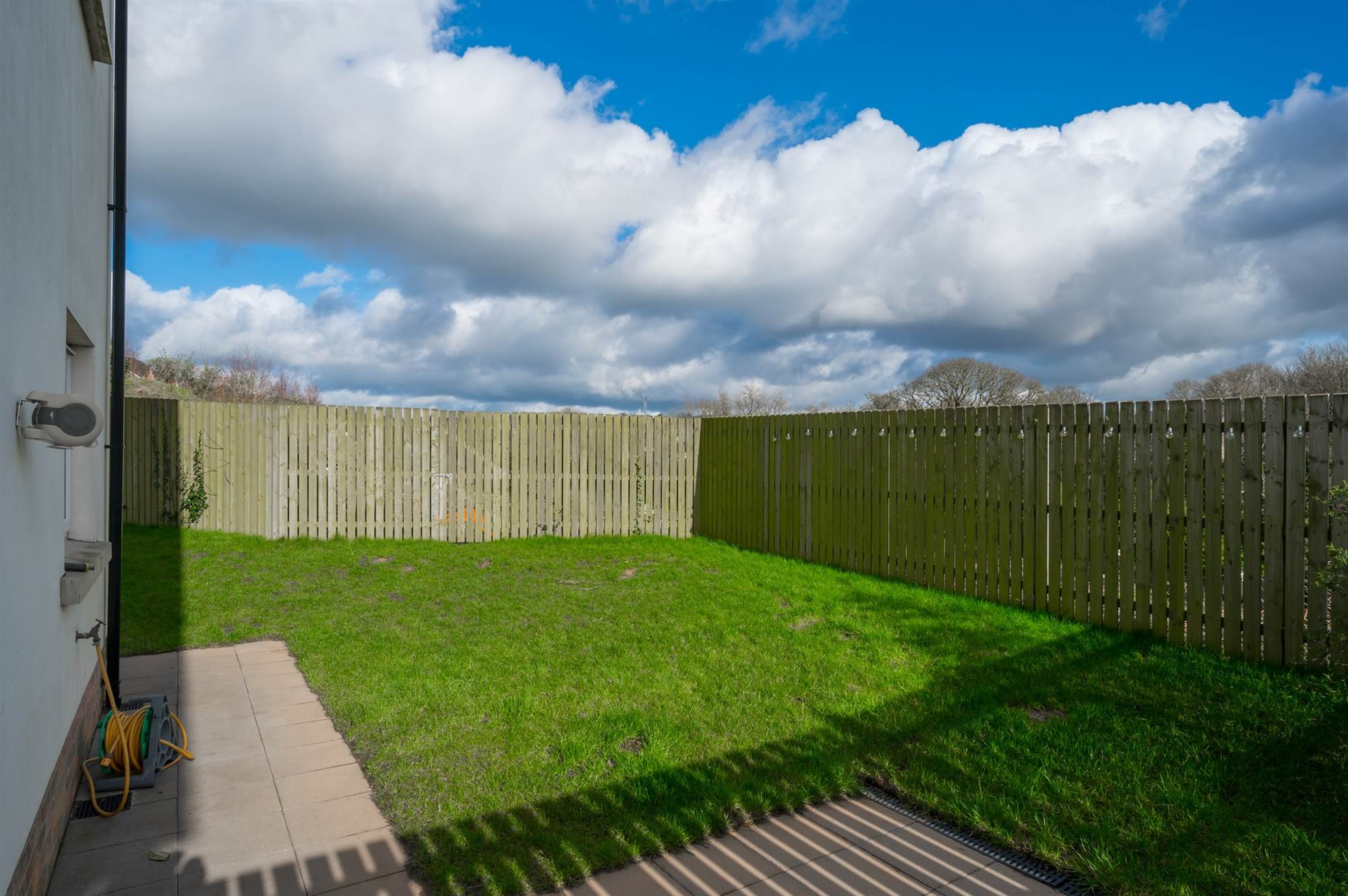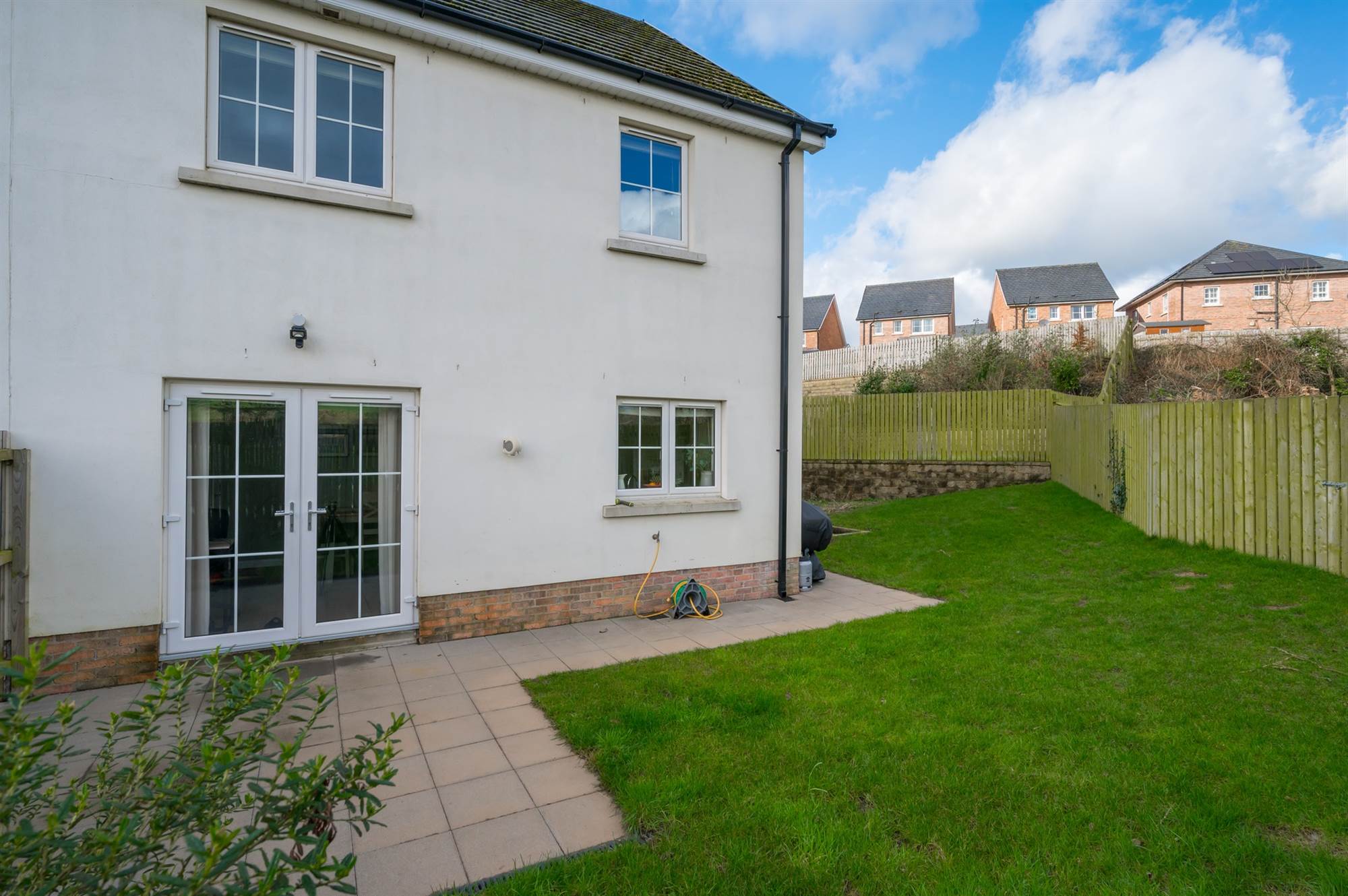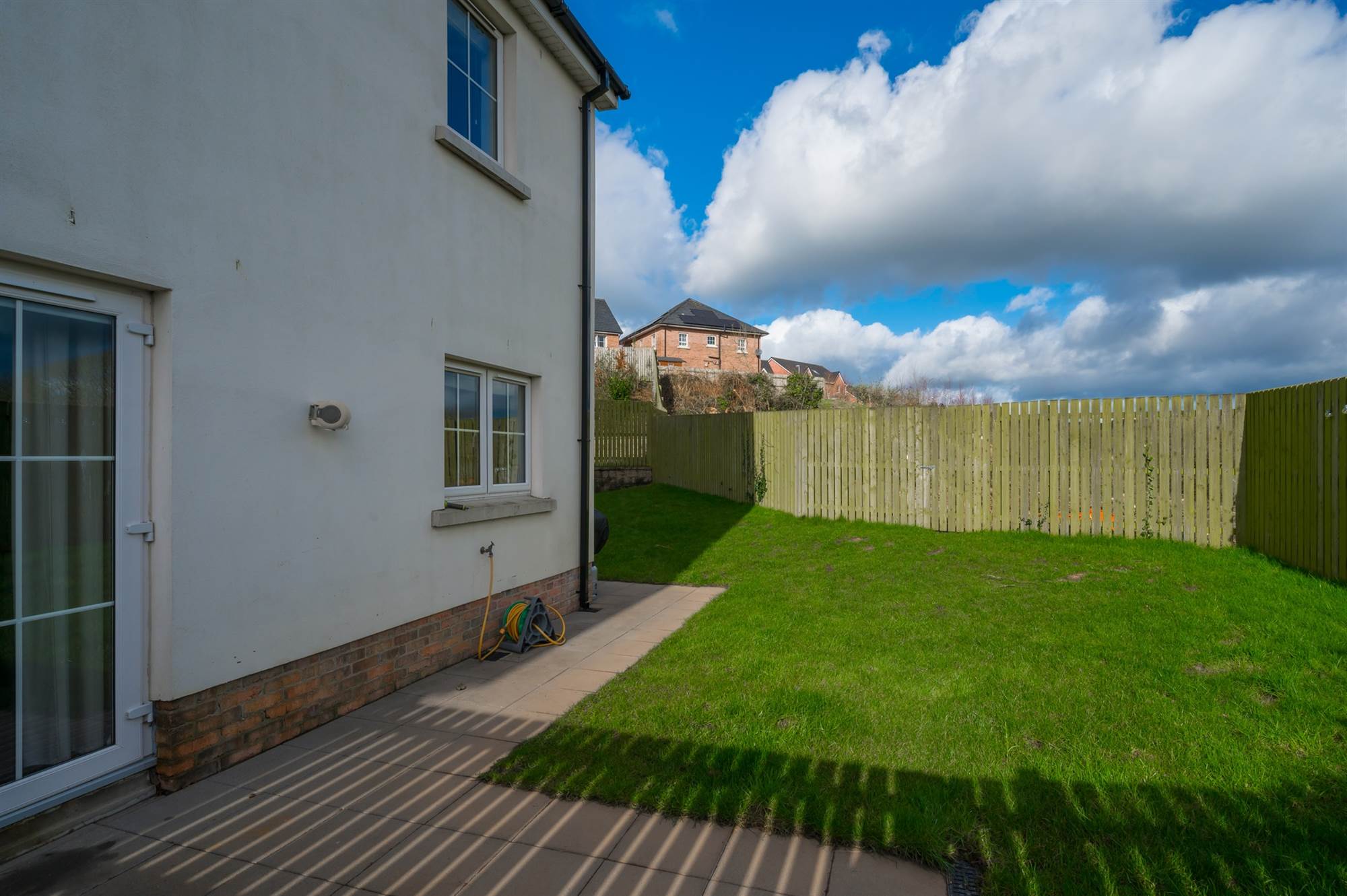 REAR: Enclosed rear garden laid in lawn with sunny aspect. Additional patio area. Flowerbed. Outside tap. Outside light.