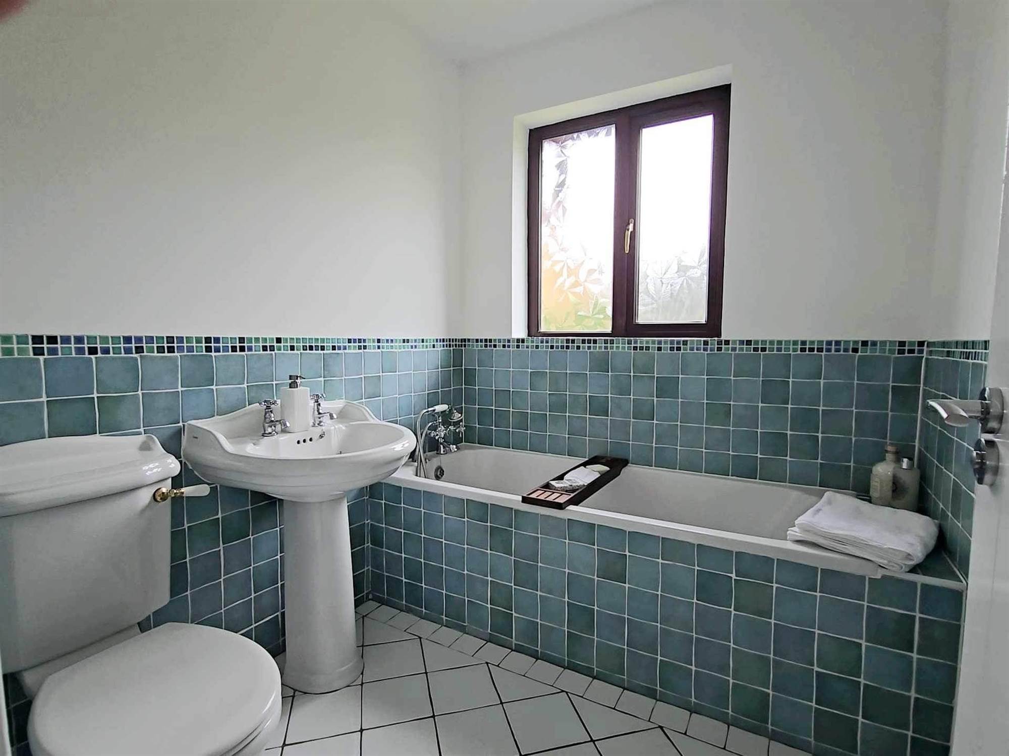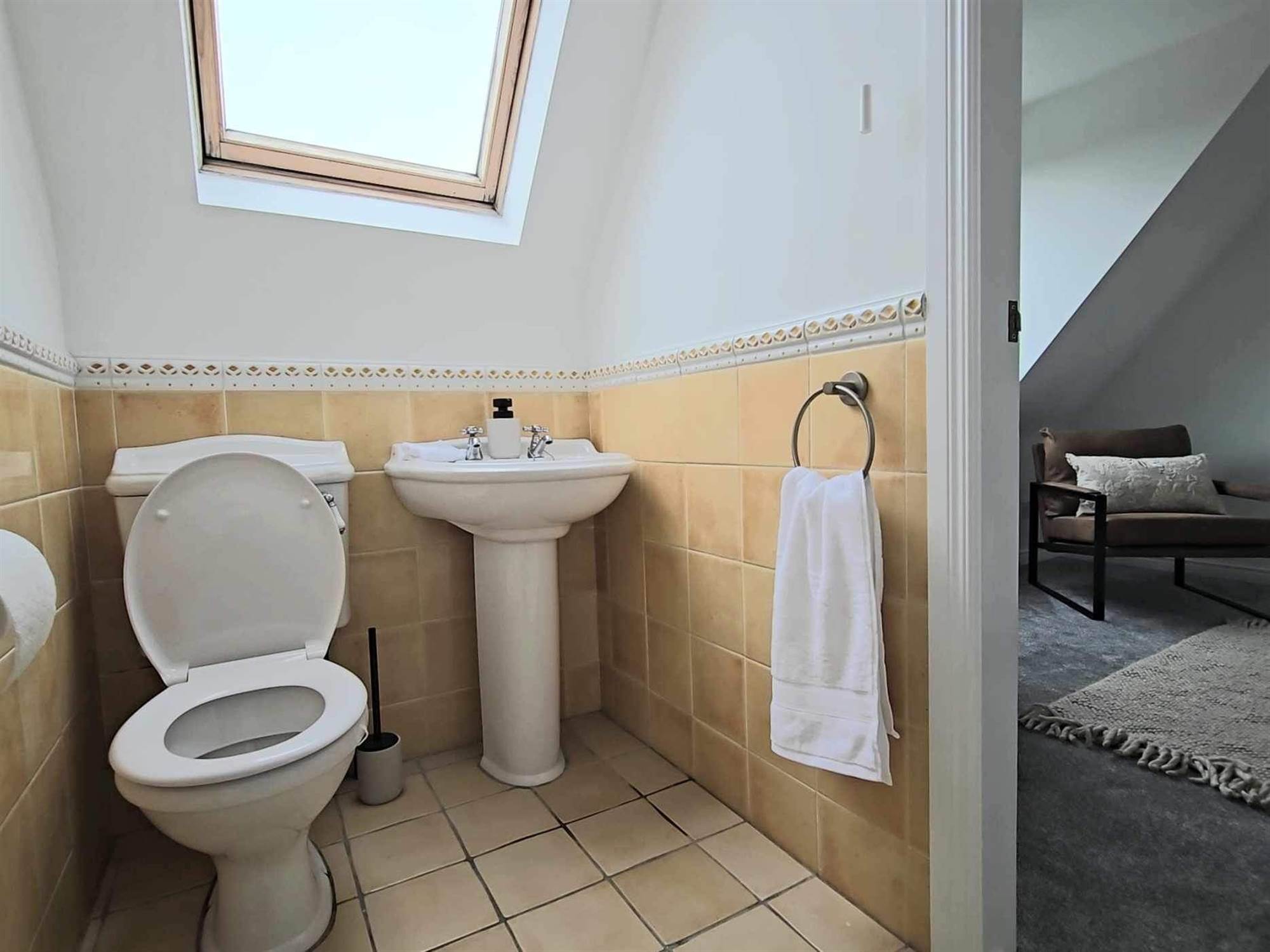 Fully tiled shower cubicle with instant heat shower, low flush WC, pedestal wash hand basin, half tiled walls.