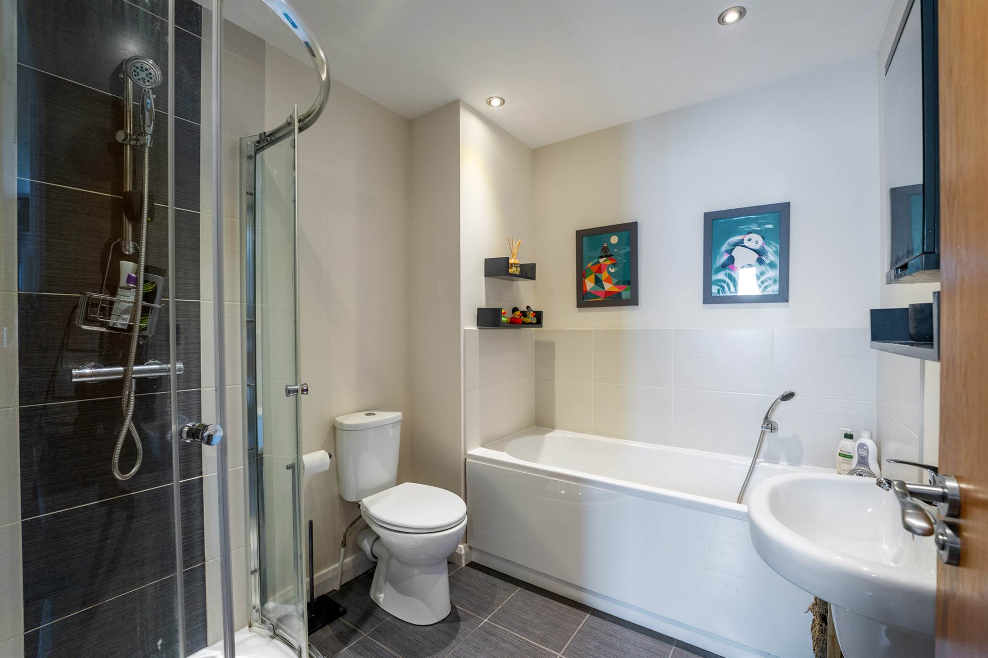 White suite comprising, panelled bath with mixer taps and shower rainhad over, fully tiled shower cubicle, single pedestal wash hand basin with mixer tap, ceramic tiled floor, push button WC, spotlights