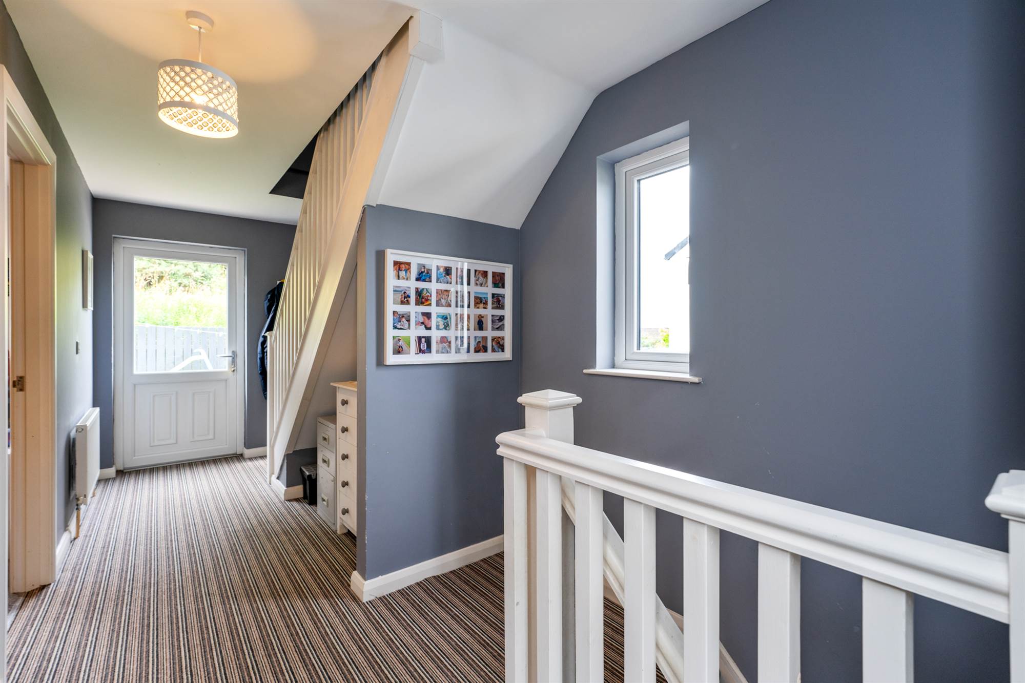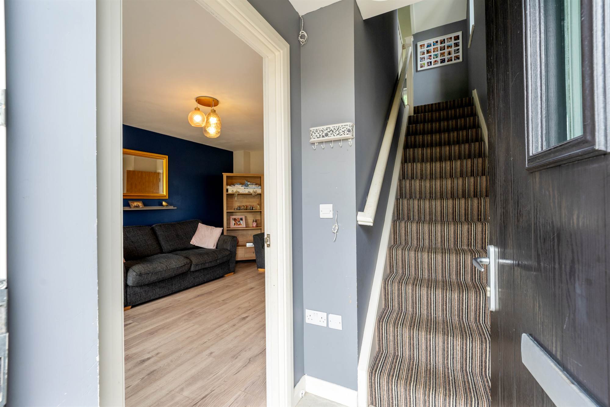 Composite front door, double glazed inset to entrance hall with ceramic tiled floor