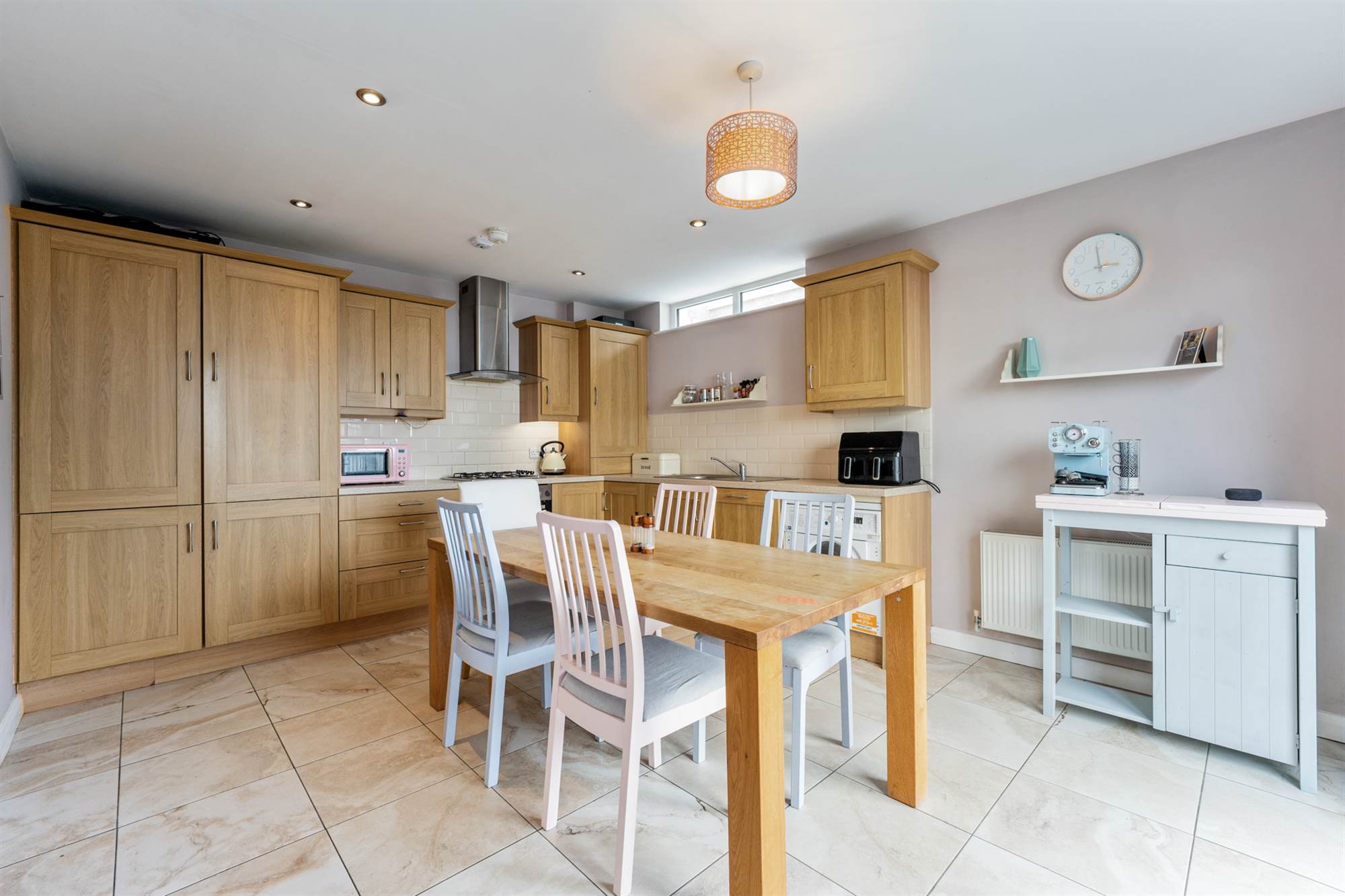 Range of modern high and low level units, single drainer stainless steel sink unit with mixer tap, part tiled wall, 4 ring gas hob, extractor fan and under bench oven, integrated washer dryer, integrated dishwasher, integrated fridge freezer, ceramic tiled floor