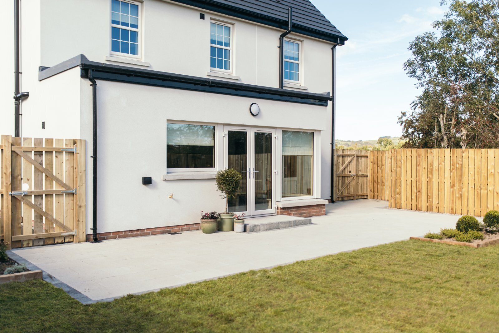 Rear garden in turf grass and front garden landscaped in keeping with the development
