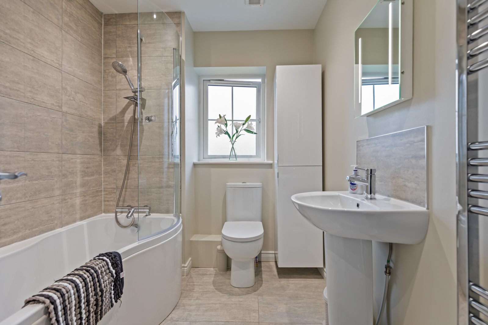White suite comprising of low flush WC, pedestal wash hand basin with mixer tap, tiled splash back, paneled bath with thermostatically controlled handset, partly tiled walls, tiled flooring, recessed spotlighting, extractor fan, vertical chrome heated towel rail.