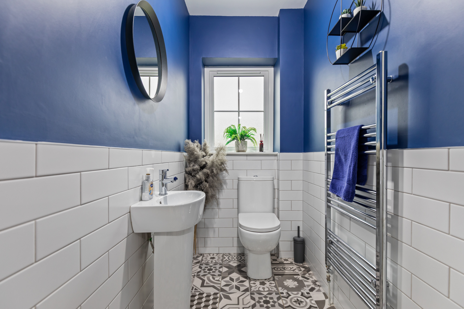 White suite comprising of low flush WC, pedestal wash hand basin with mixer tap, tiled flooring, partly tiled walls, vertical chrome heated towel rail.