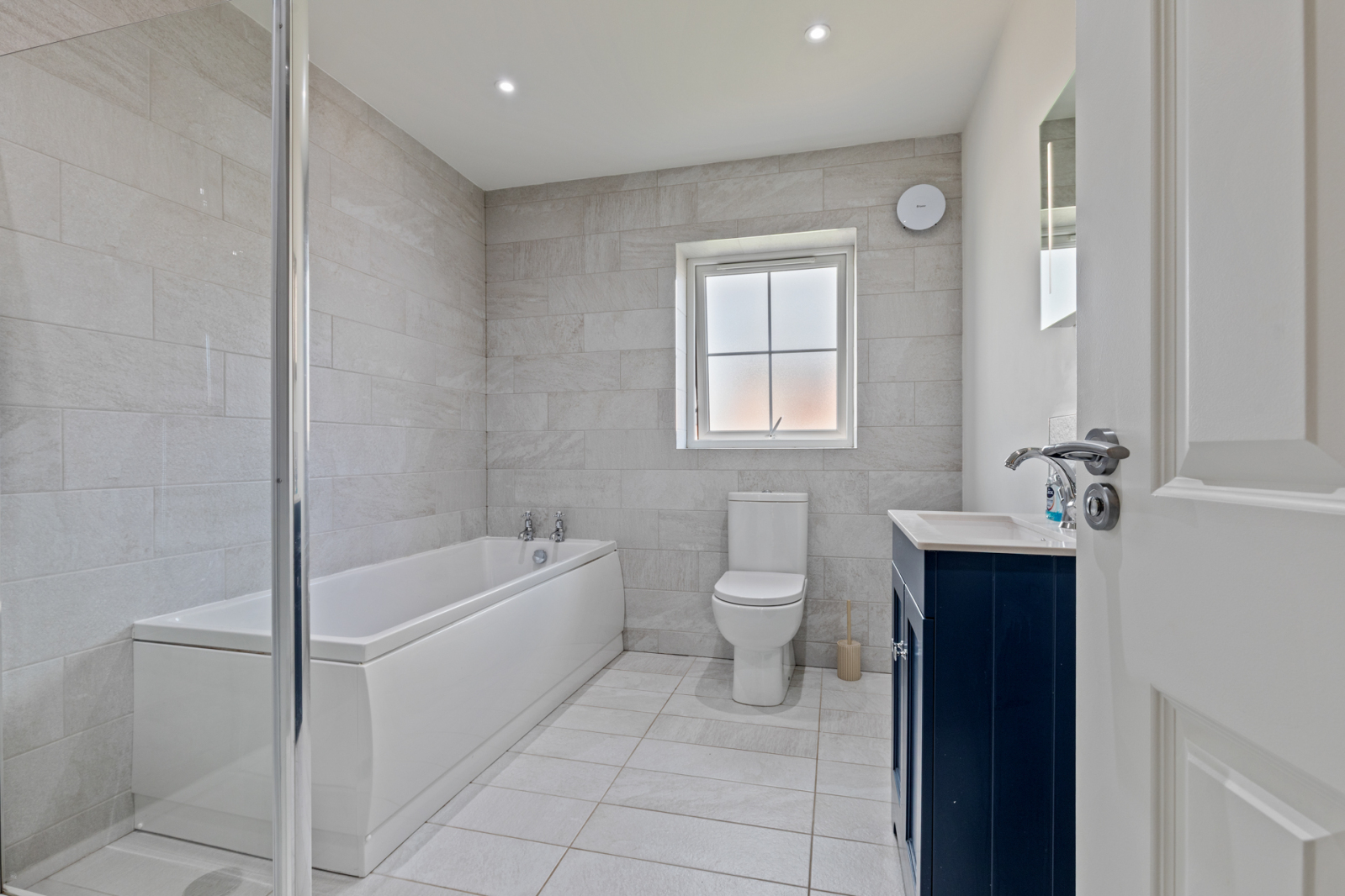 White suite comprising of low flush WC, wash hand basin with mixer tap, tiled splash back, walk-in thermostatically controlled shower with rainfall shower head and handset, partly tiled walls, tiled flooring, recessed spotlighting, extractor fan.