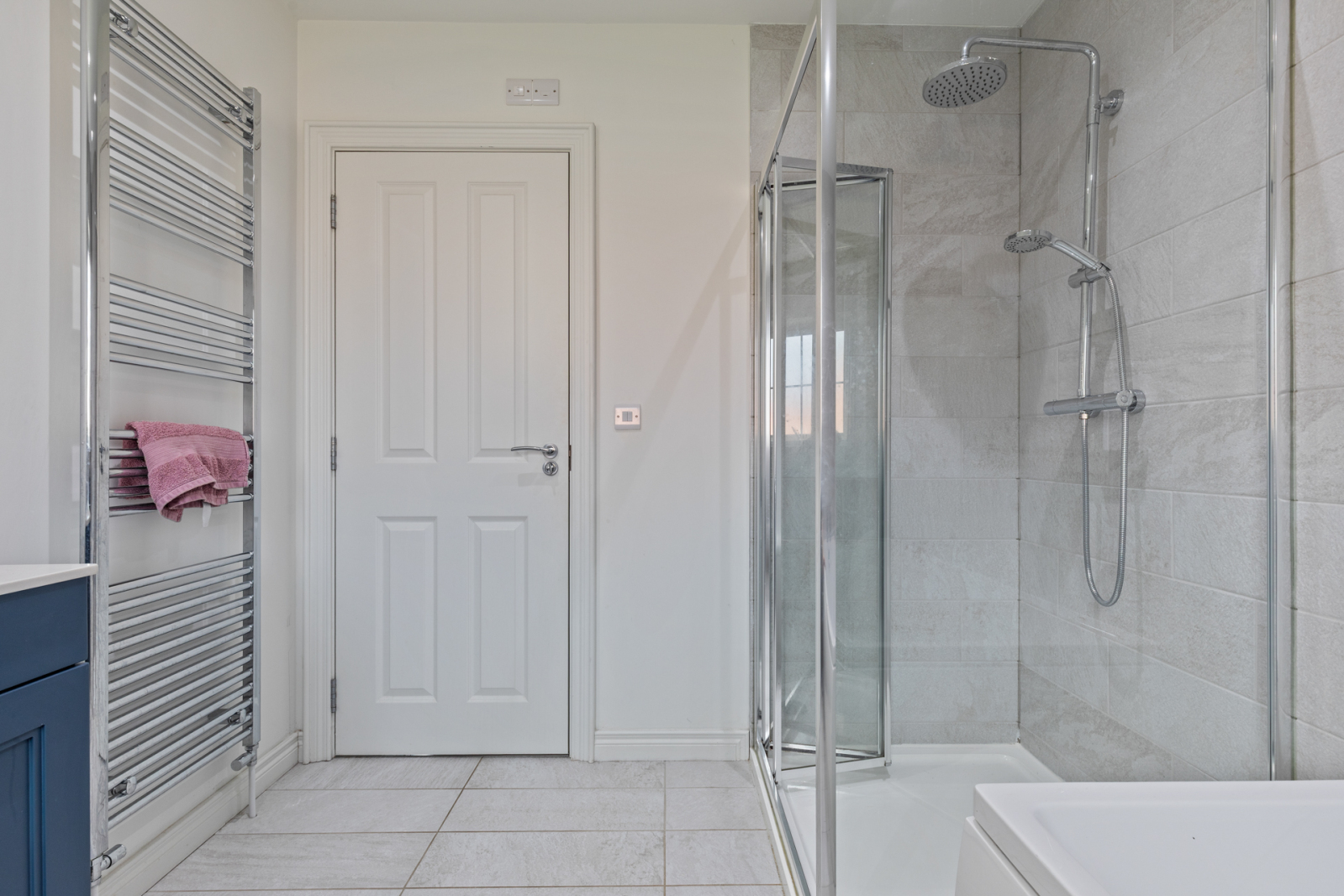 White suite comprising of low flush WC, wash hand basin with mixer tap and tiled splash back, storage below, walk-in thermostatically controlled shower with rainfall shower head and handset, paneled bath with hot and cold tap, tiled flooring, partly tiled walls, recessed spotlighting, extractor fan, vertical chrome heated towel rail.
