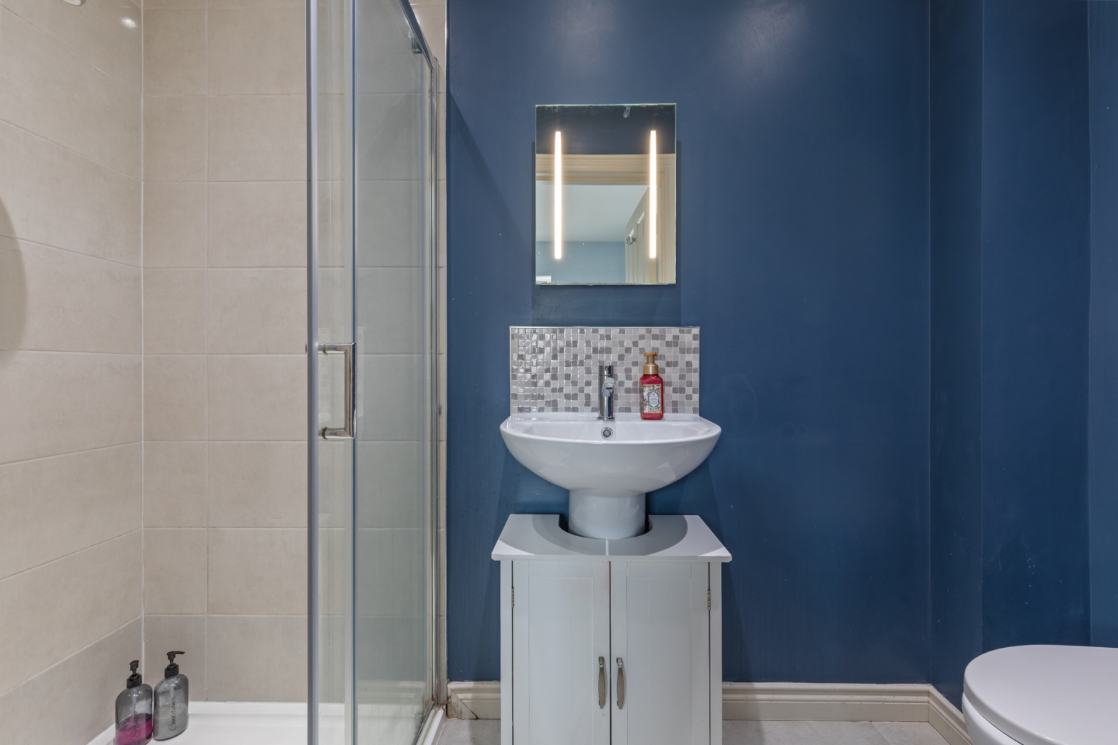 White suite comprising of low flush WC, wash hand basin with mixer tap, walk-in thermostatically controlled shower, partly tiled walls, tiled flooring, recessed spotlighting, extractor fan.