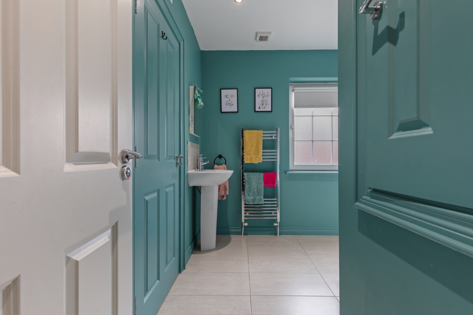 White suite comprising of low flush WC, wash hand basin with mixer tap, tiled splash back. Panelled bath with mixer tap and handset, partly tiled walls, tiled flooring, recessed spotlighting, extractor fan, vertical chrome heated towel rail, storage cupboard.