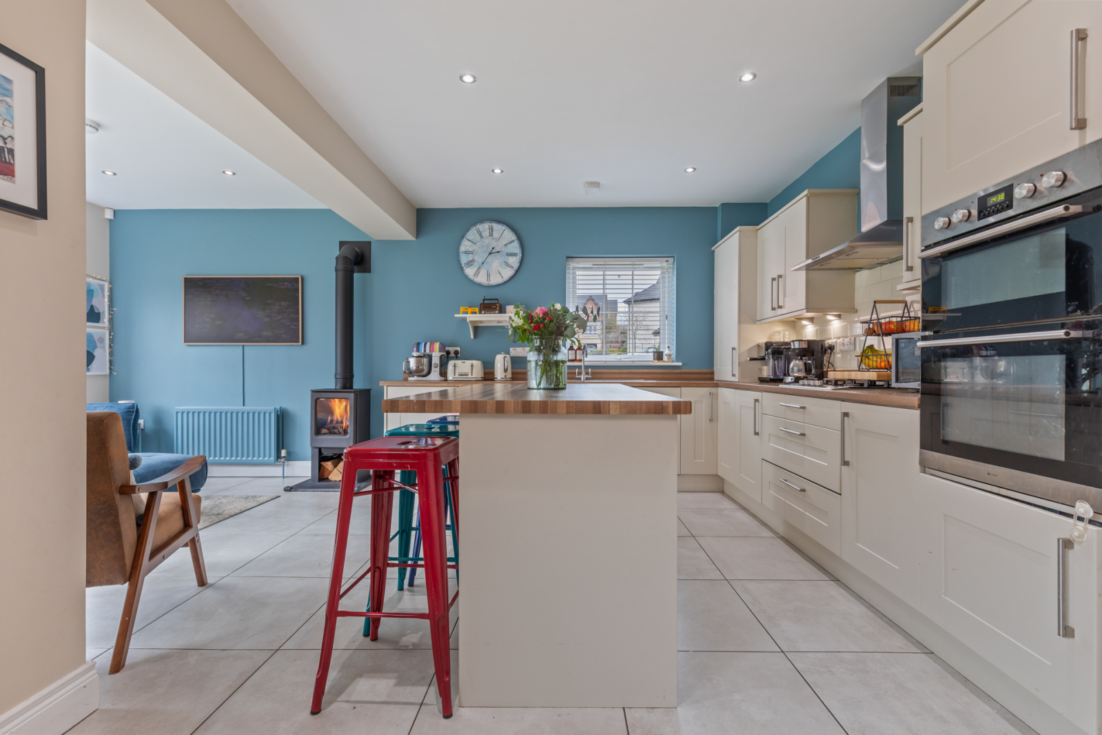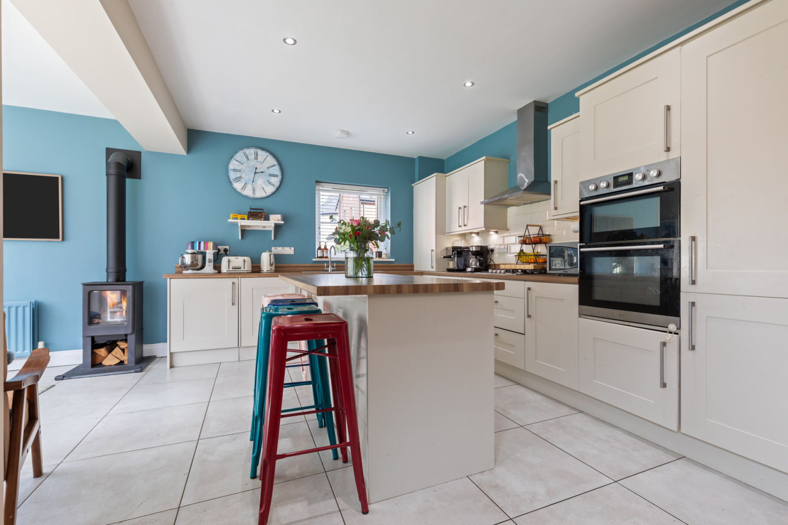Range of high and low level units with laminate work surface and stainless steel sink unit and drainer, 1.5 tub with mixer tap, integrated fridge freezer, integrated double oven, four ring gas hob with stainless steel extractor fan above, integrated dishwasher, integrated washing machine, island unit for casual dining, partly tiled walls, tiled flooring, recessed spotlighting, open to dining and sun room, cast iron gas stove, double uPVC door leading to rear garden.