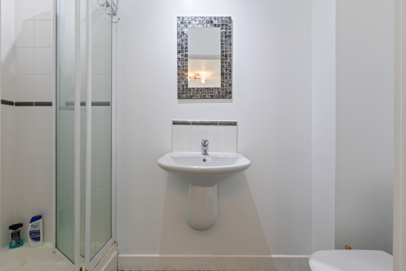 White suite comprising of low flush WC, floating wash had basin, mixer tap, tiled splash back, walk-in electric shower unit, partly tiled walls, vinyl flooring, extractor fan.