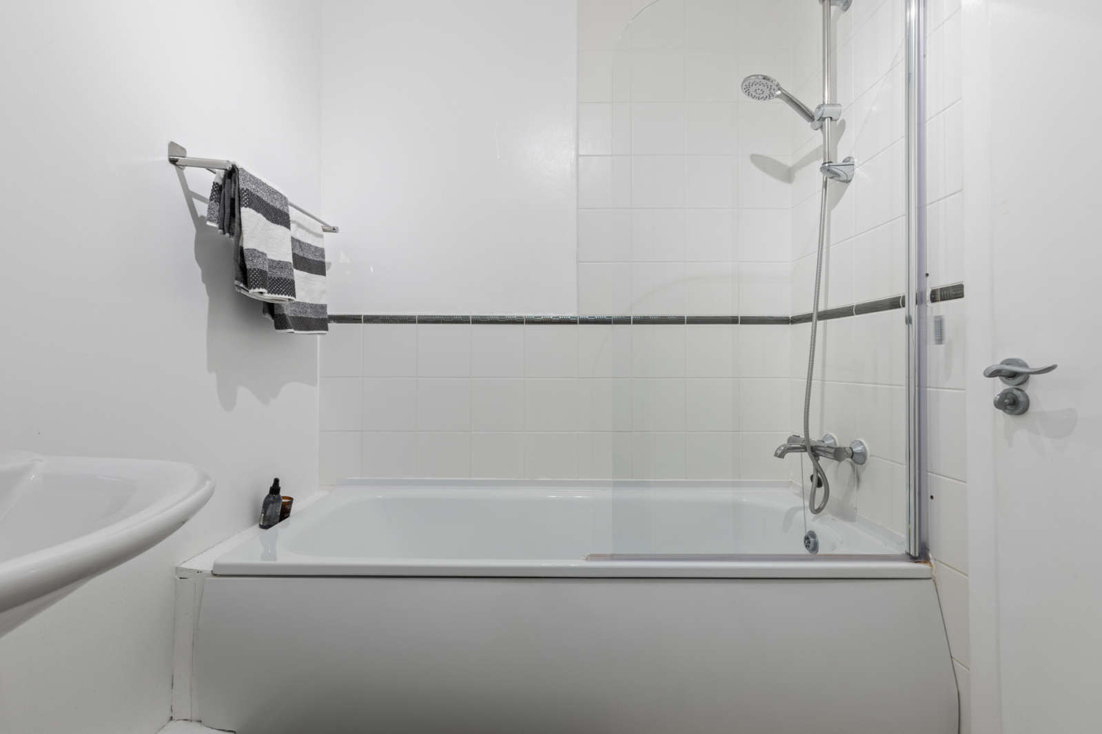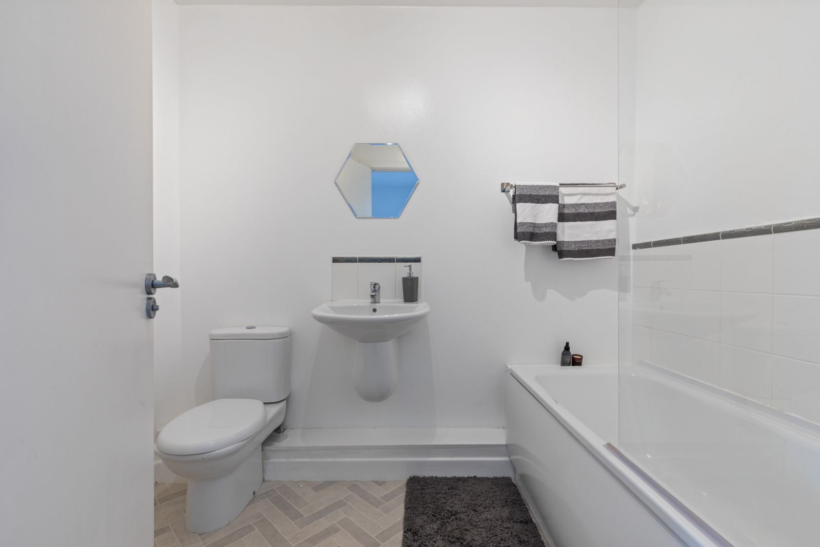 White suite comprising of low flush WC, floating was hand basin, mixer tap, tiled splash back, paneled bath, with thermostatically controlled shower, party tiled walls, tiled flooring, extractor fan.