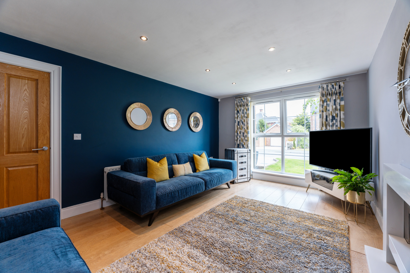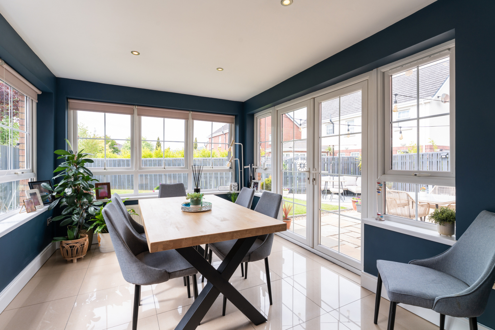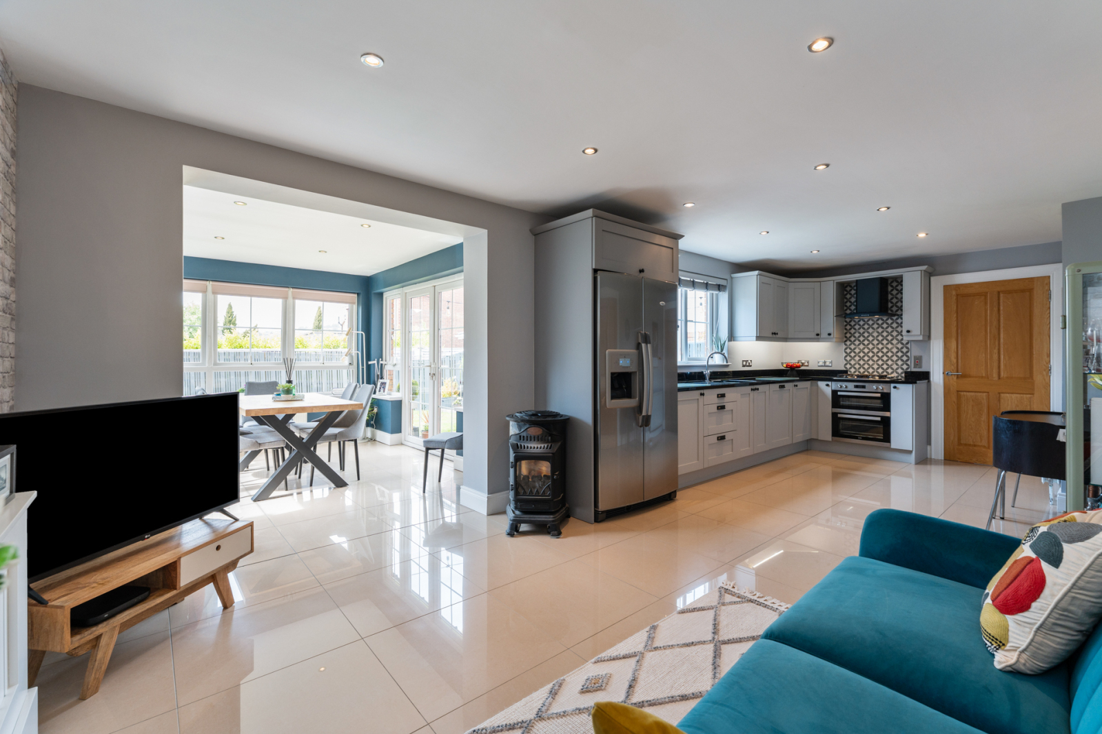Internally, the home is immaculately presented and thoughtfully laid out. A bright and welcoming hallway leads into a generously proportioned living room with a feature gas fireplace. The true hub of the home is the contemporary kitchen/dining area seamlessly opening into the spacious sunroom. This open-plan space is ideal for modern family living, with an abundance of natural light and double doors opening onto the beautifully landscaped gardens. To the first floor, the accommodation continues to impress, offering four well-proportioned bedrooms. The principal bedroom benefits from a stylish ensuite shower room and a modern family bathroom complete with a contemporary white suite.