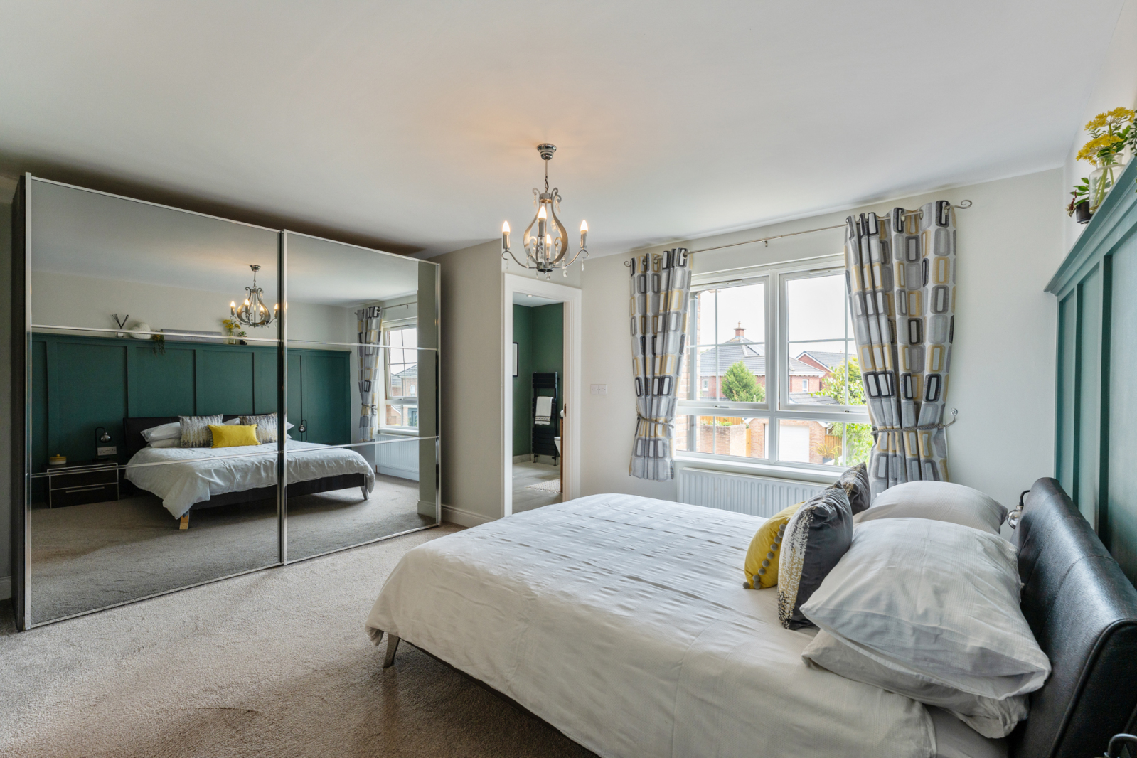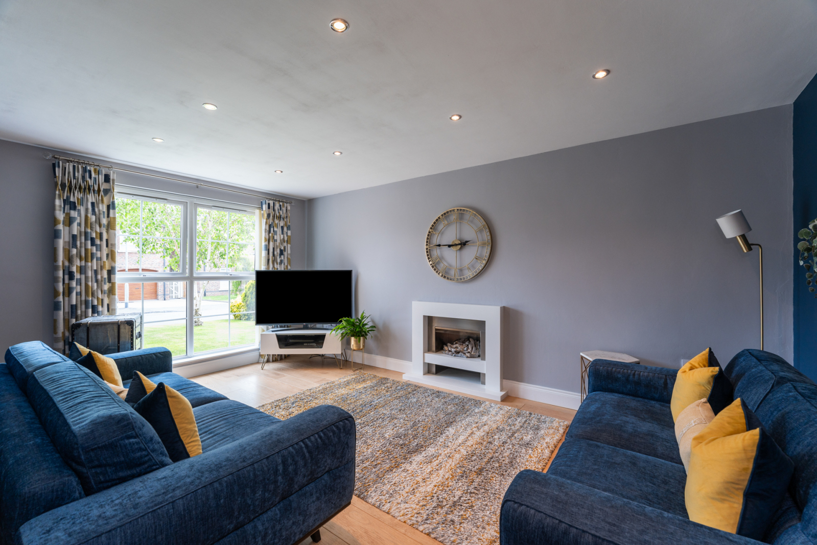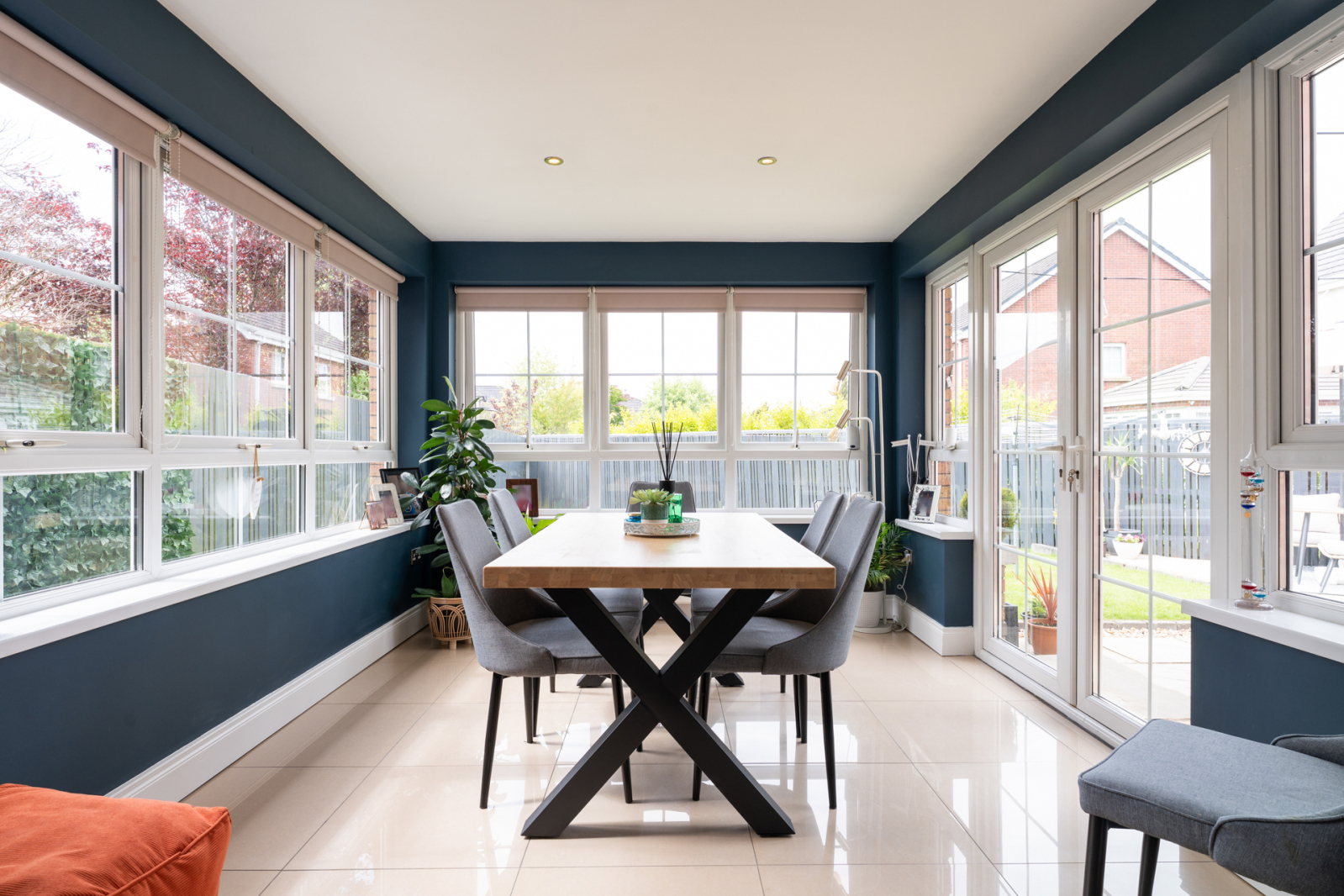 Internally, the home is immaculately presented and thoughtfully laid out. A bright and welcoming hallway leads into a generously proportioned living room with a feature gas fireplace. The true hub of the home is the contemporary kitchen/dining area seamlessly opening into the spacious sunroom. This open-plan space is ideal for modern family living, with an abundance of natural light and double doors opening onto the beautifully landscaped gardens. To the first floor, the accommodation continues to impress, offering four well-proportioned bedrooms. The principal bedroom benefits from a stylish ensuite shower room and a modern family bathroom complete with a contemporary white suite.