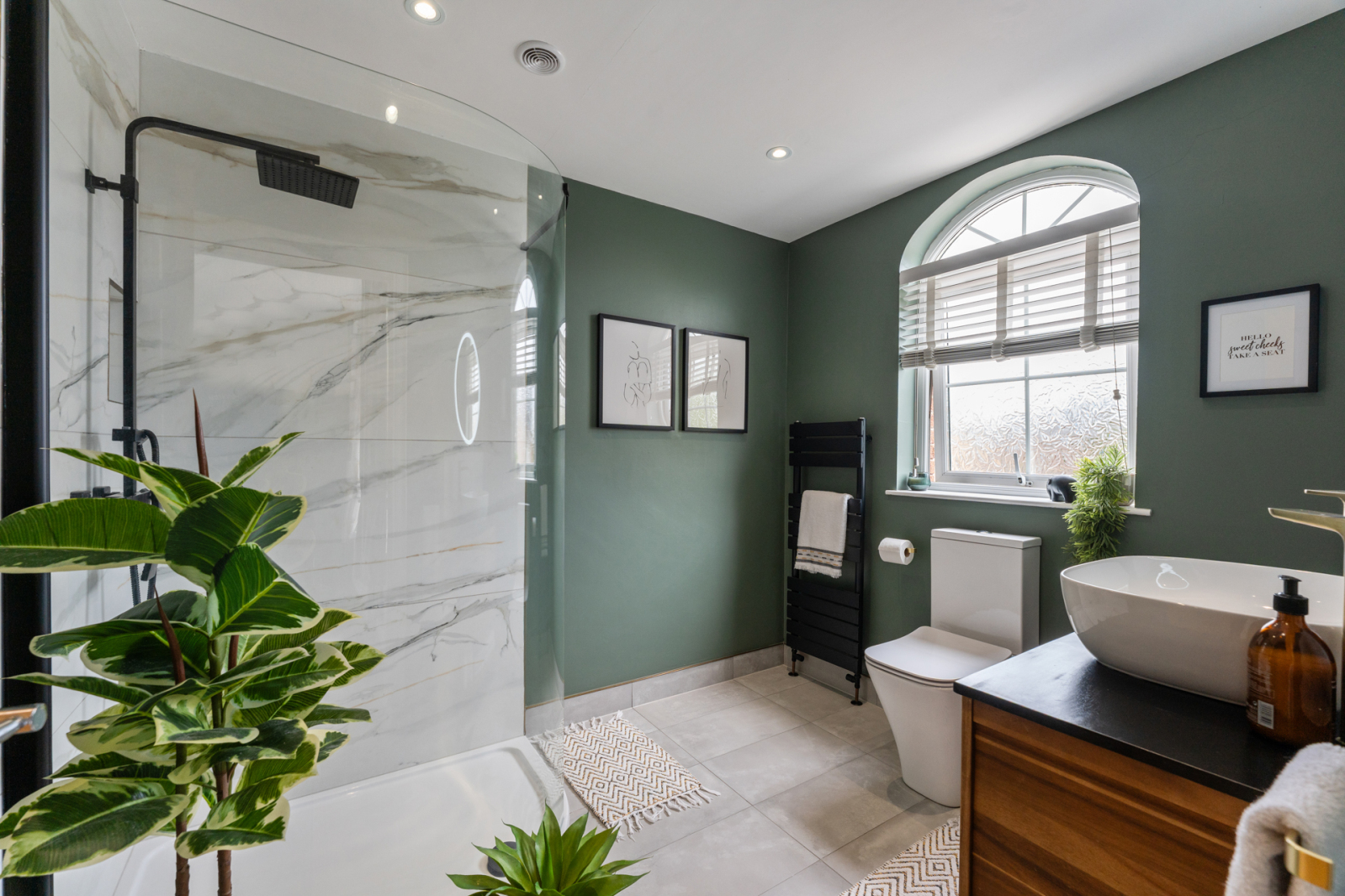 Low flush WC, wash hand basin with mixer tap and storage below, thermostatically controlled shower with rainhead shower, partly tiled walls, tiled floor, spotlighting, extractor fan