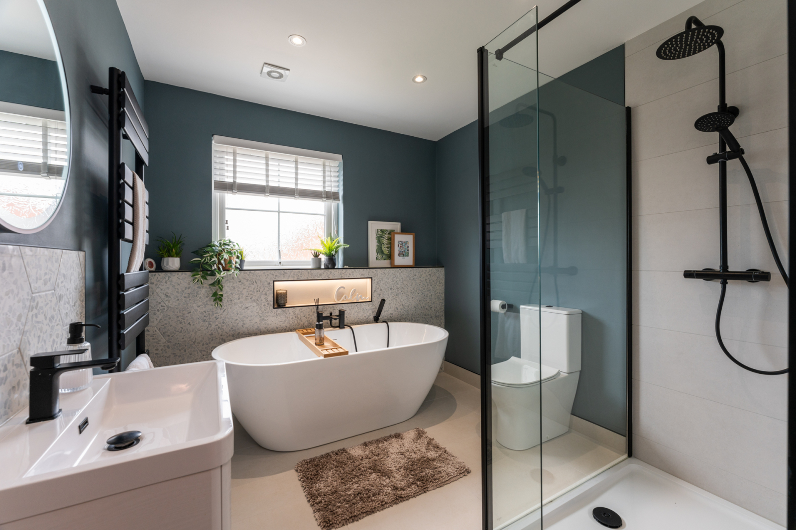 Low flush WC, vanity unit with wash hand basin and mixer tap, stand alone bath with hot and cold tap and handset, walk in thermostatically controlled shower with rainfall shower head and handset, partly tiled walls, tiled flooring, recessed spotlighting, extractor fan, vertical chrome heated towel rail