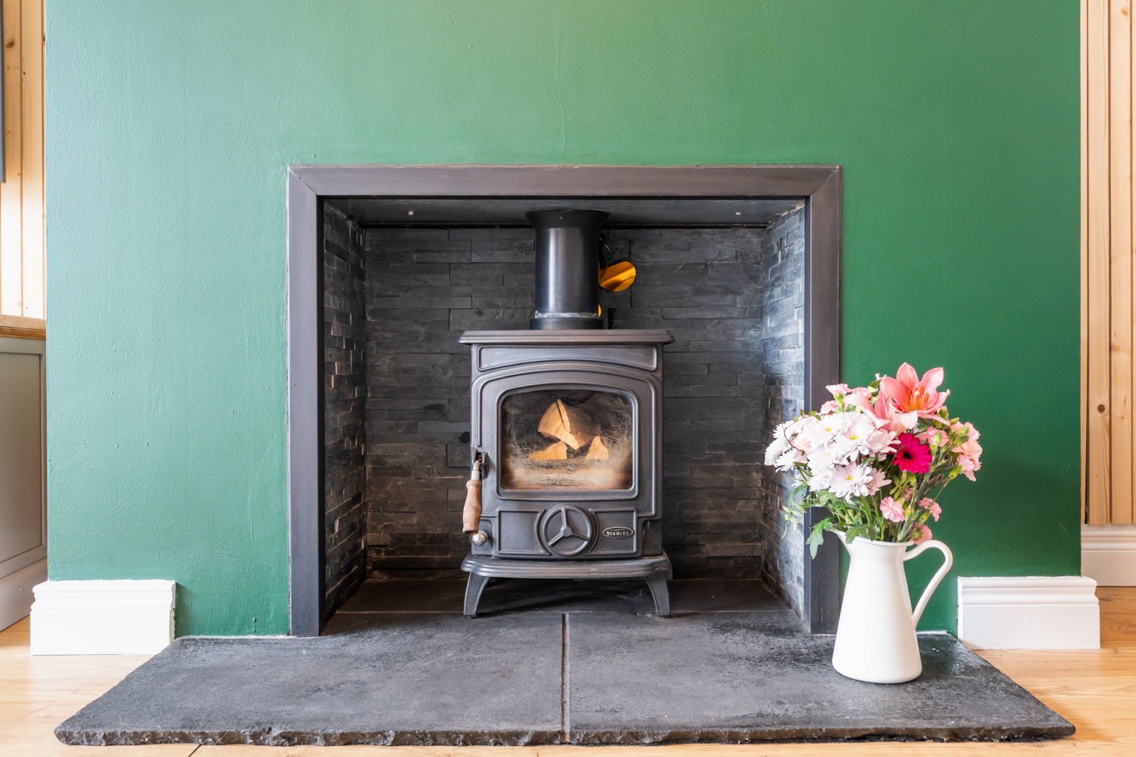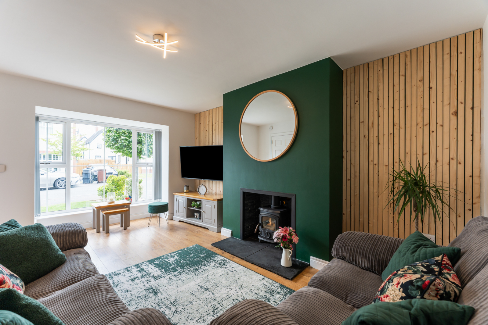 Hole in the wall fireplace with mulit-fuel burning stove, tiled inset and slate hearth, laminate wood effect flooring, feature square bay window