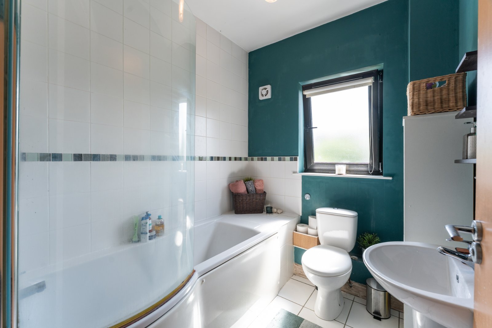 Low flush WC, floating wash hand basin with mixer tap and tiled splashback, panelled bath with thermostatically controlled shower, hot and cold tap, partly tiled walls, tiled flooring, extractor fan