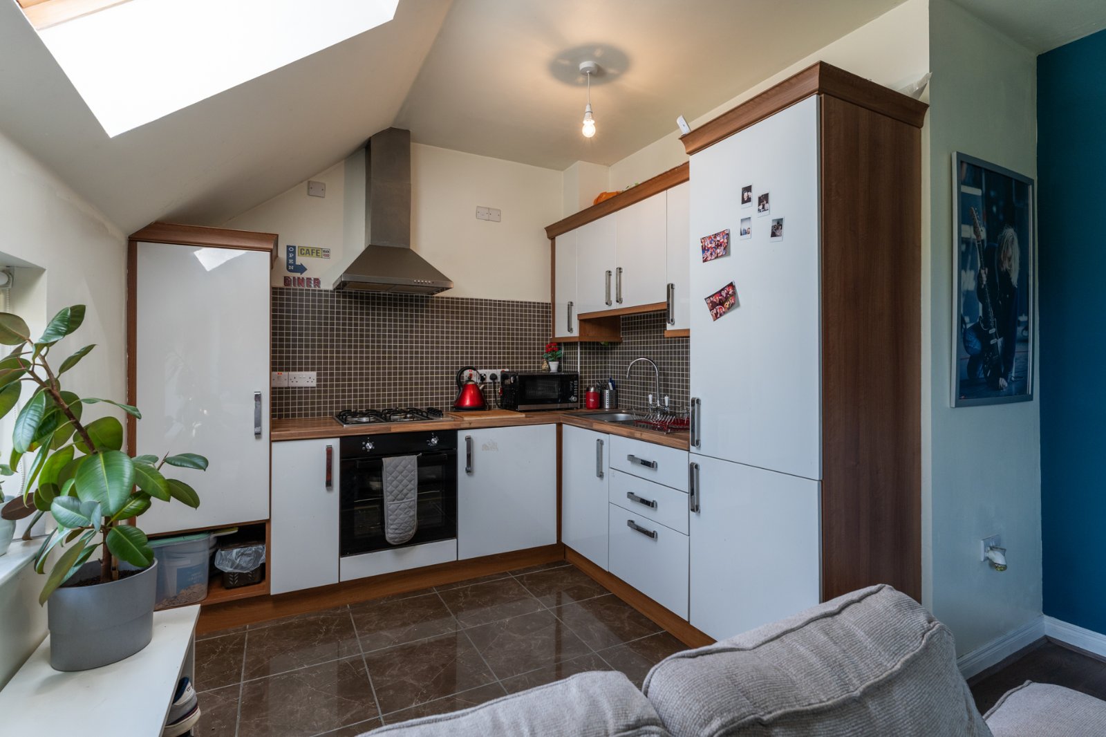 Fantastic range of high and low level units, laminate work surface with stainless steel sink unit and drainer 1.5 tub with hot and cold tap, integrated fridge freezer, integrated oven with 4 ring gas hob, extractor fan, Valliant gas boiler, integrated washing machine, tiled flooring, partly tiled walls, open plan to living dining area with laminate wood effect flooring. Juliette balcony, outlook to side