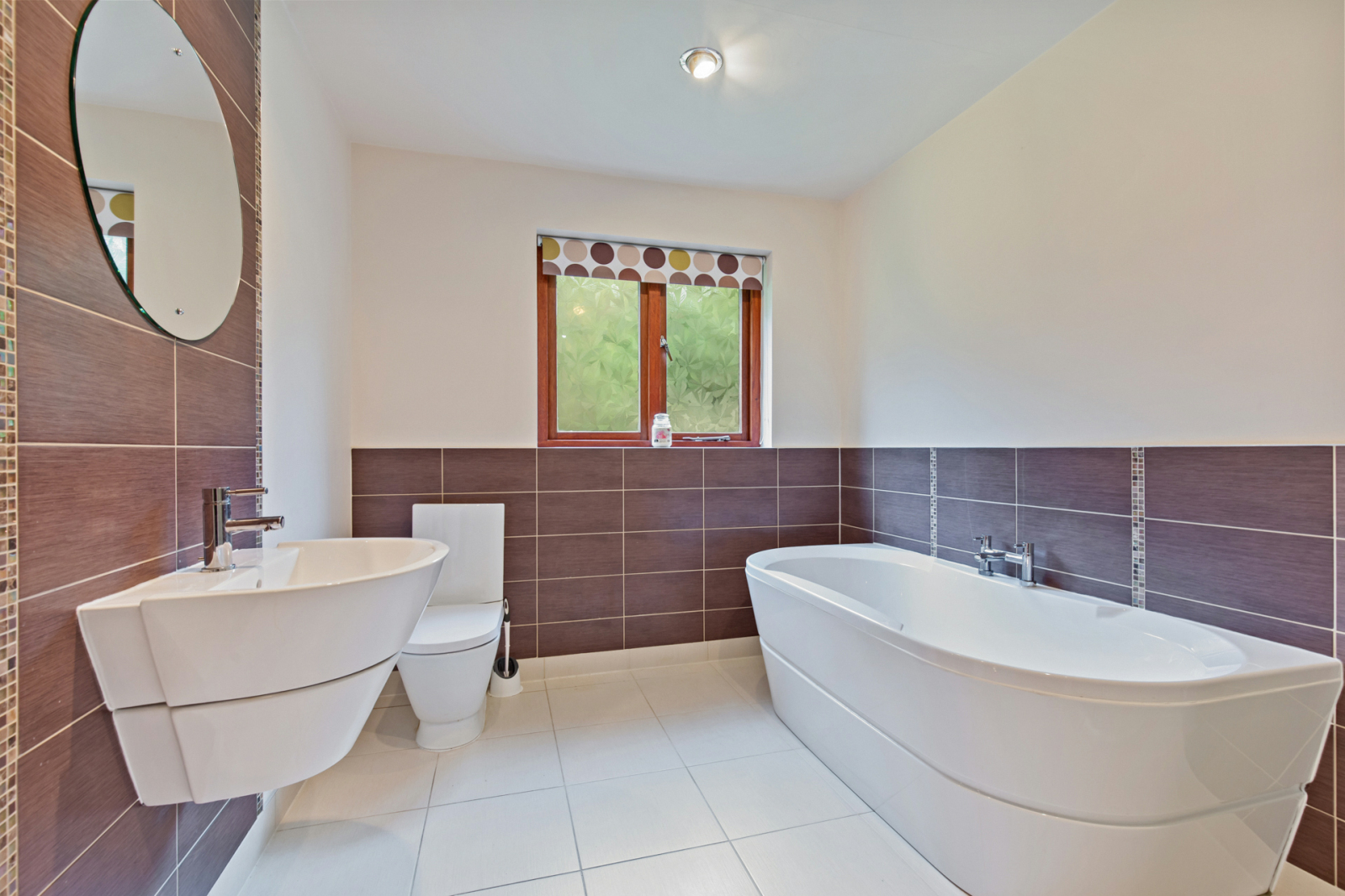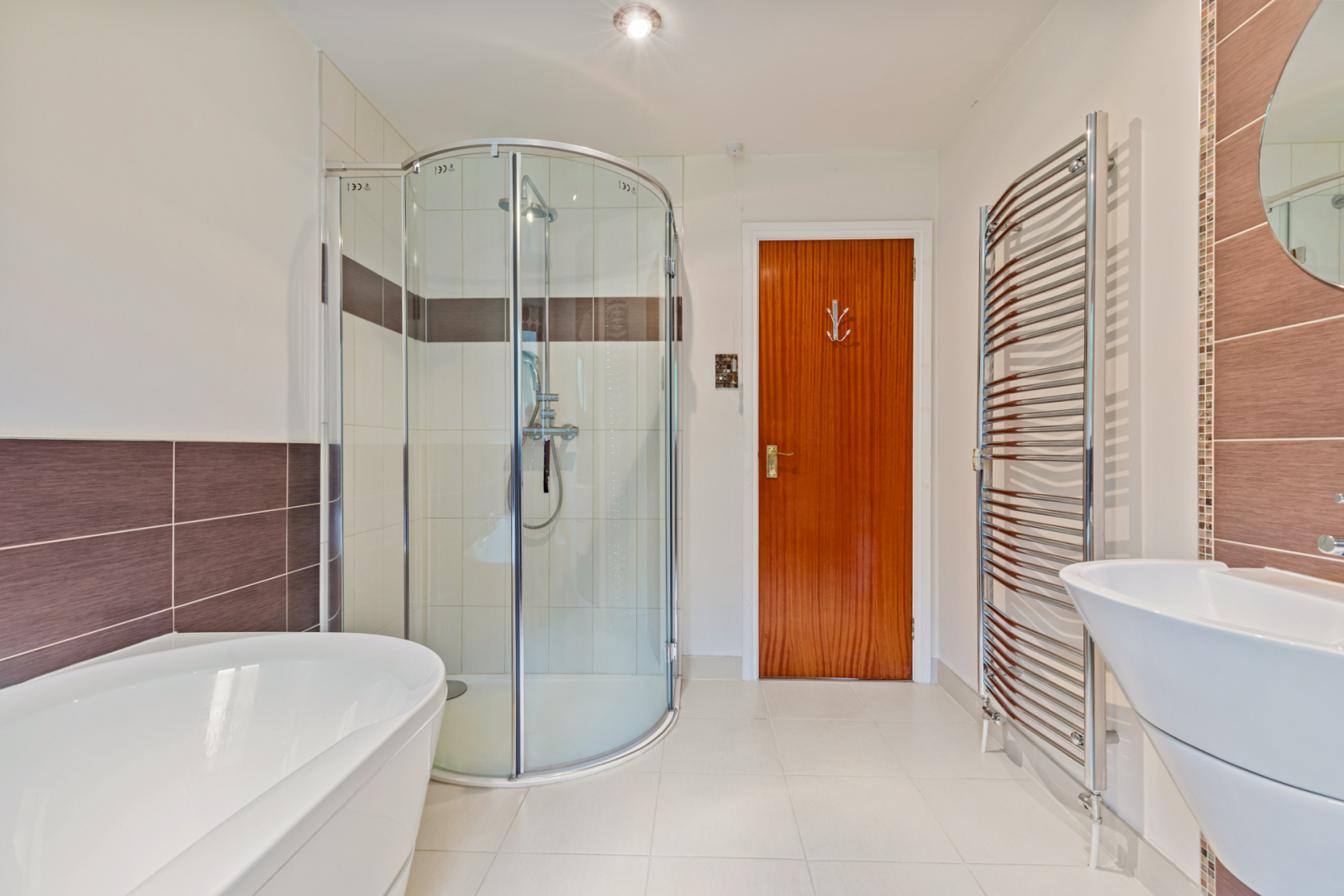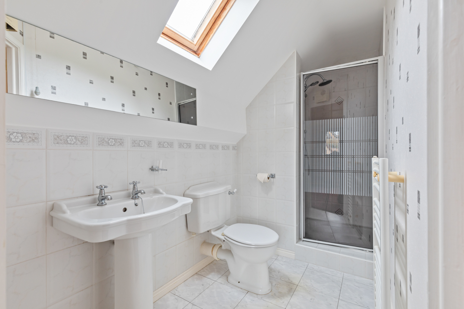 White suite comprising: Panelled bath with mixer taps, fully tiled shower cubicle, thermostatic shower, low flush WC, semi pedestal wash hand basin with mixer taps, partly tiled walls, chrome towel radiator, ceramic tiled floor.