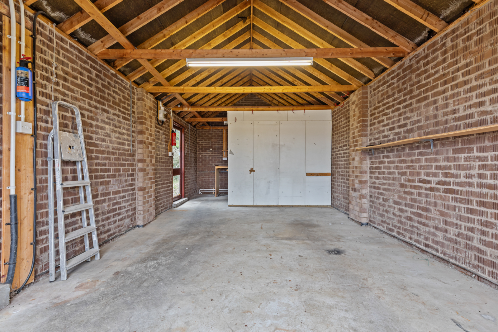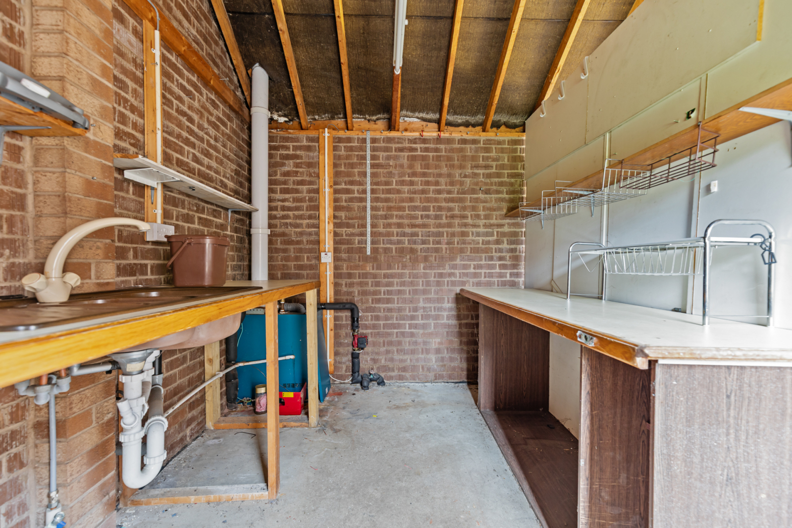 Up and over door, power and light. Service door to side. Plumbed for washing machine.